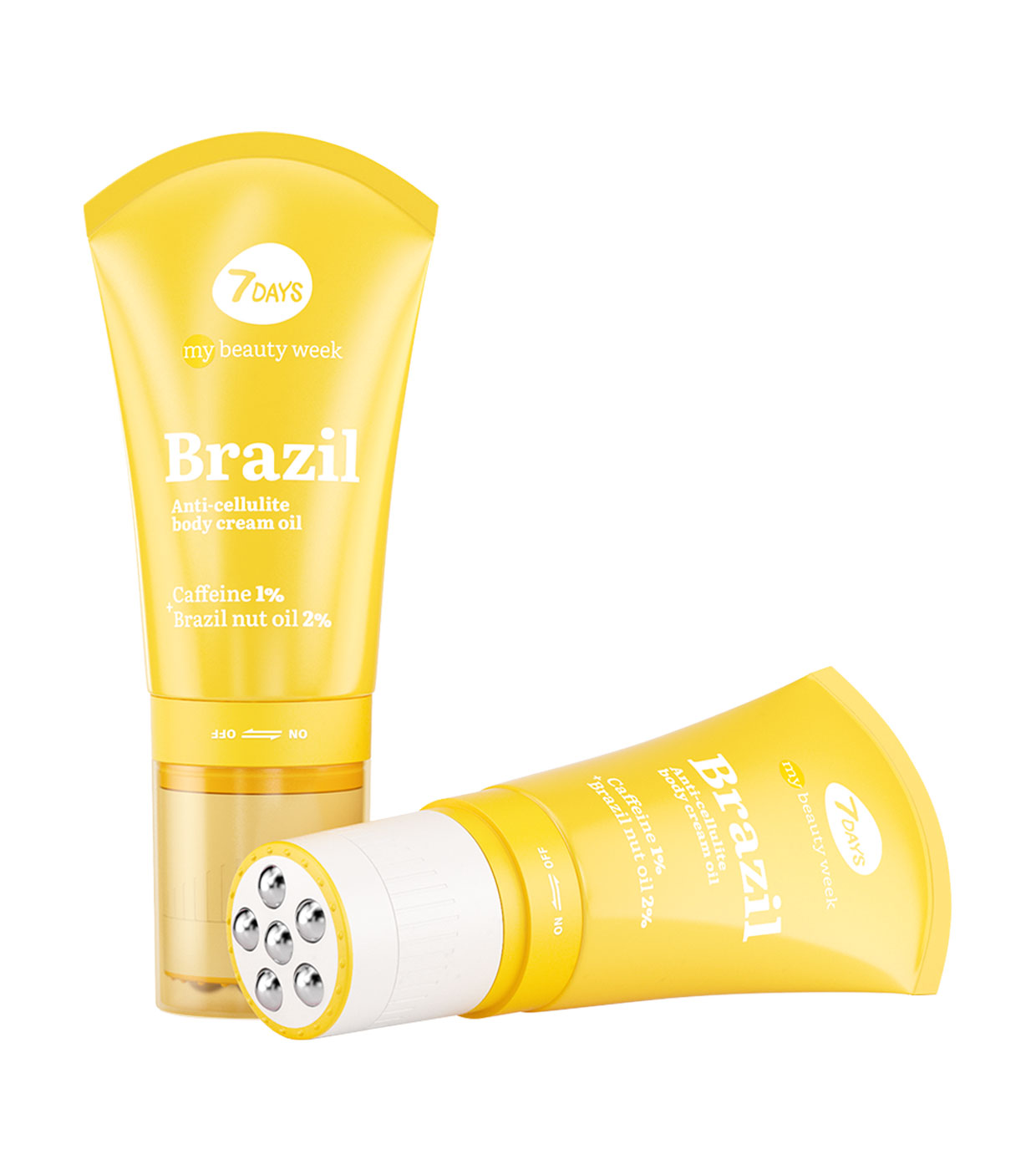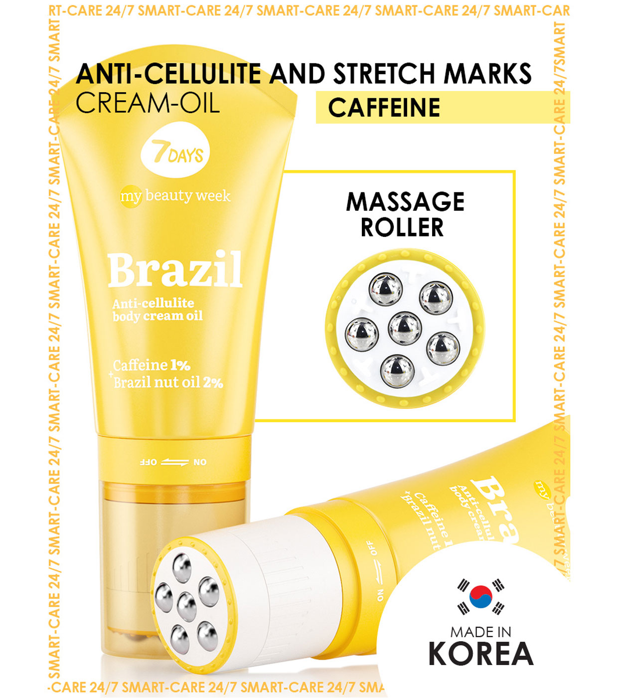 Experience the power of the Modeling Cream + Massage Oil + Roller 3in1 7DAYS, an innovative combination of 3D massage and Korean cosmetics with active ingredients such as caffeine and Brazil nut oil.