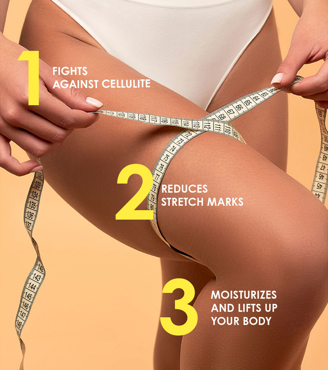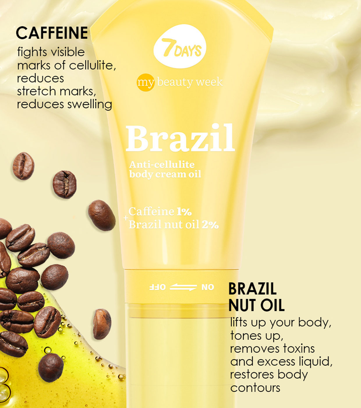 Caffeine, recognized for its ability to combat visible cellulite marks, tones the skin and helps eliminate excess fluids. Brazil nut oil provides a powerful lifting effect, nourishes, softens and renews the skin.