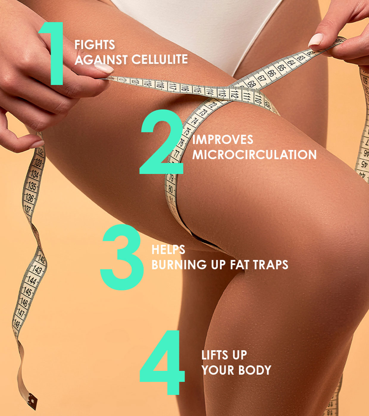 Menthol, known to improve microcirculation, contributes to burning fat traps and visually smoothes the relief of the skin.