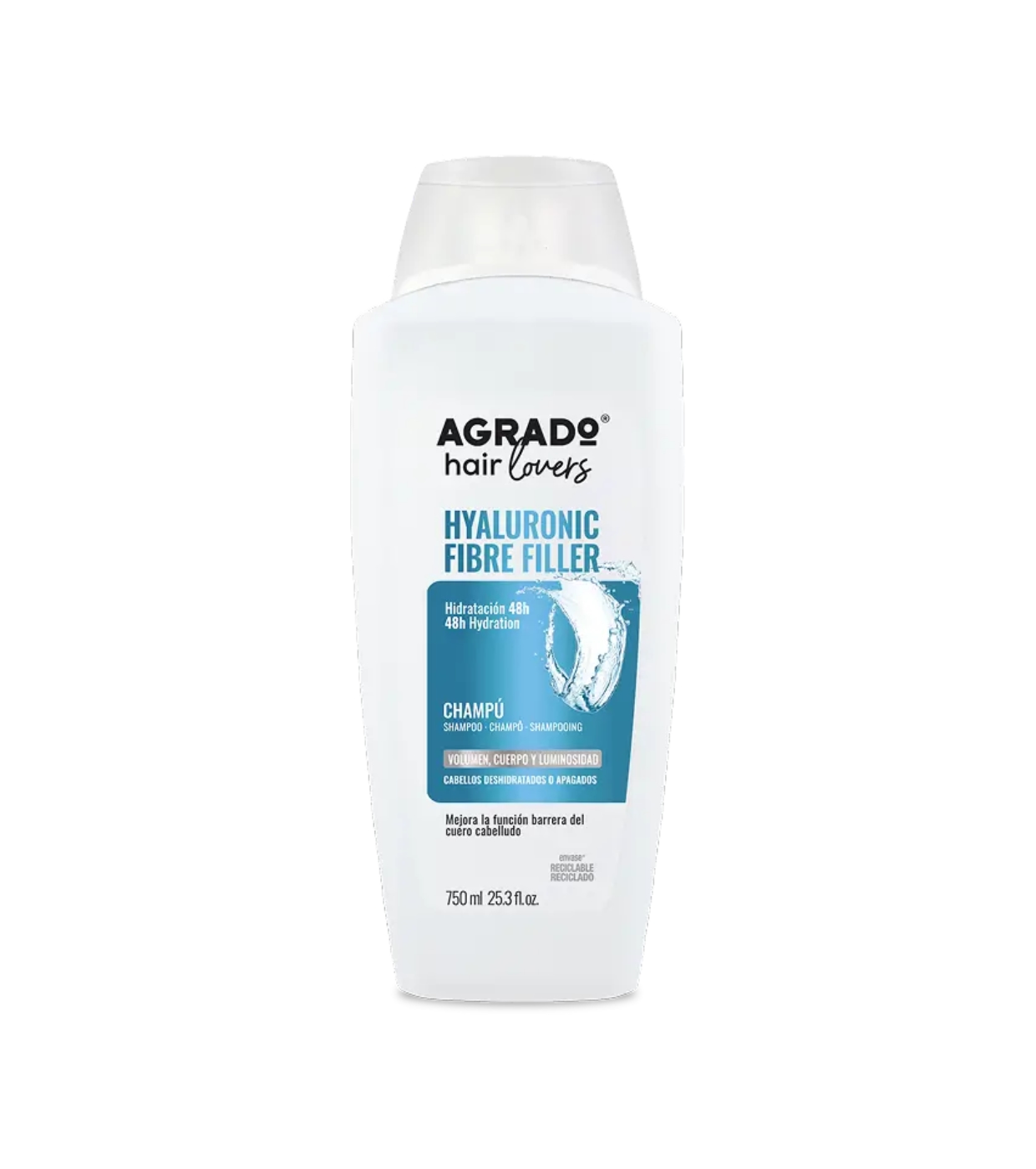 Recover the vitality and shine of your hair with Hyaluronic Fibre Filler Agrado. Shampoo .