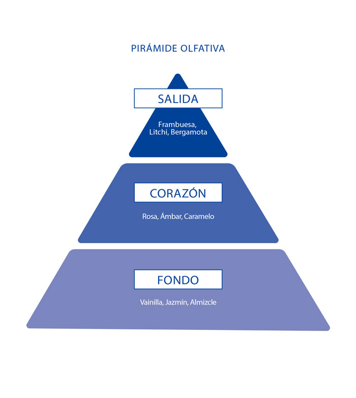 Its top notes have hints of red fruits such as raspberry and a touch of bergamot, which merge into a heart of notes of rose, amber and caramel, gradually acquiring persistence, a background with notes of vanilla, jasmine and musk.