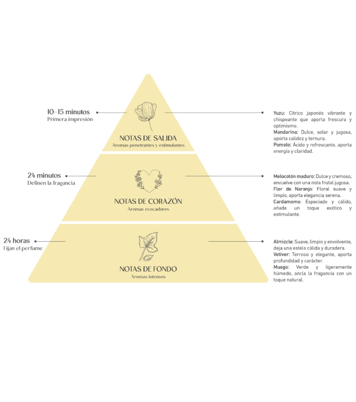 The vibrant and refreshing Japanese yuzu combines with the velvety sweetness of the peach, creating a positive, comforting and stimulating atmosphere that helps relieve stress and elevate mood.