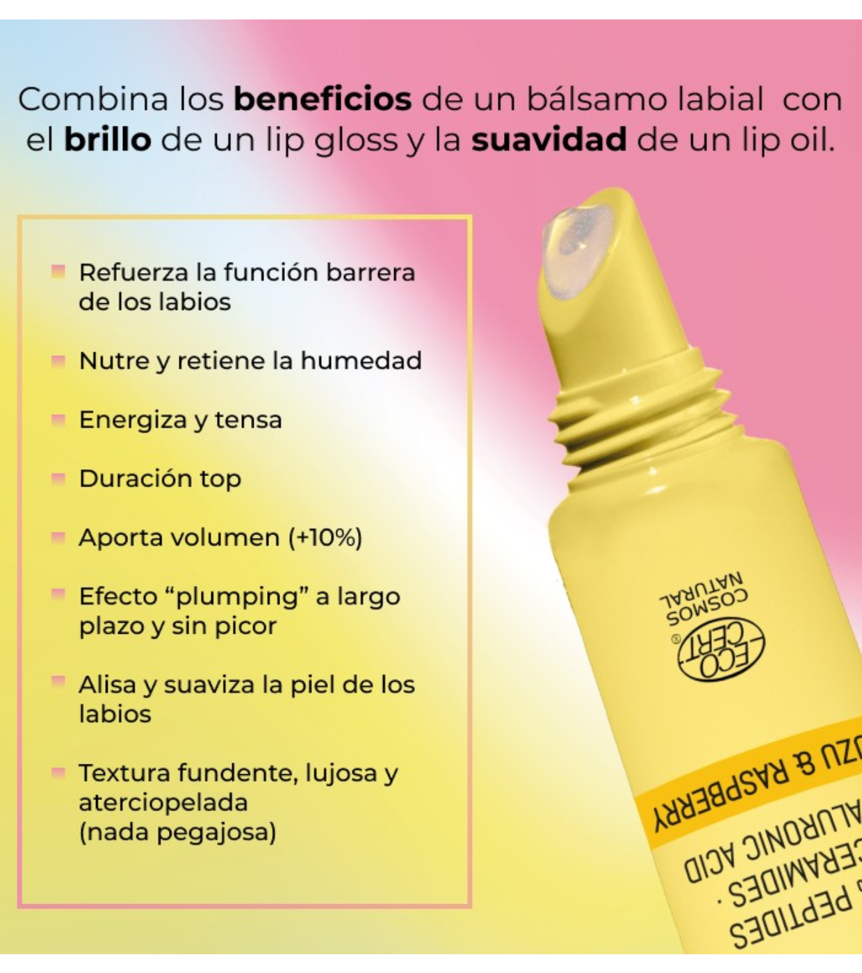 - Low molecular weight hyaluronic acid microspheres: multiply hydration and volumize lips by +10%.