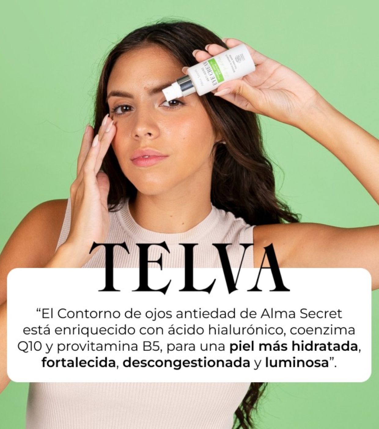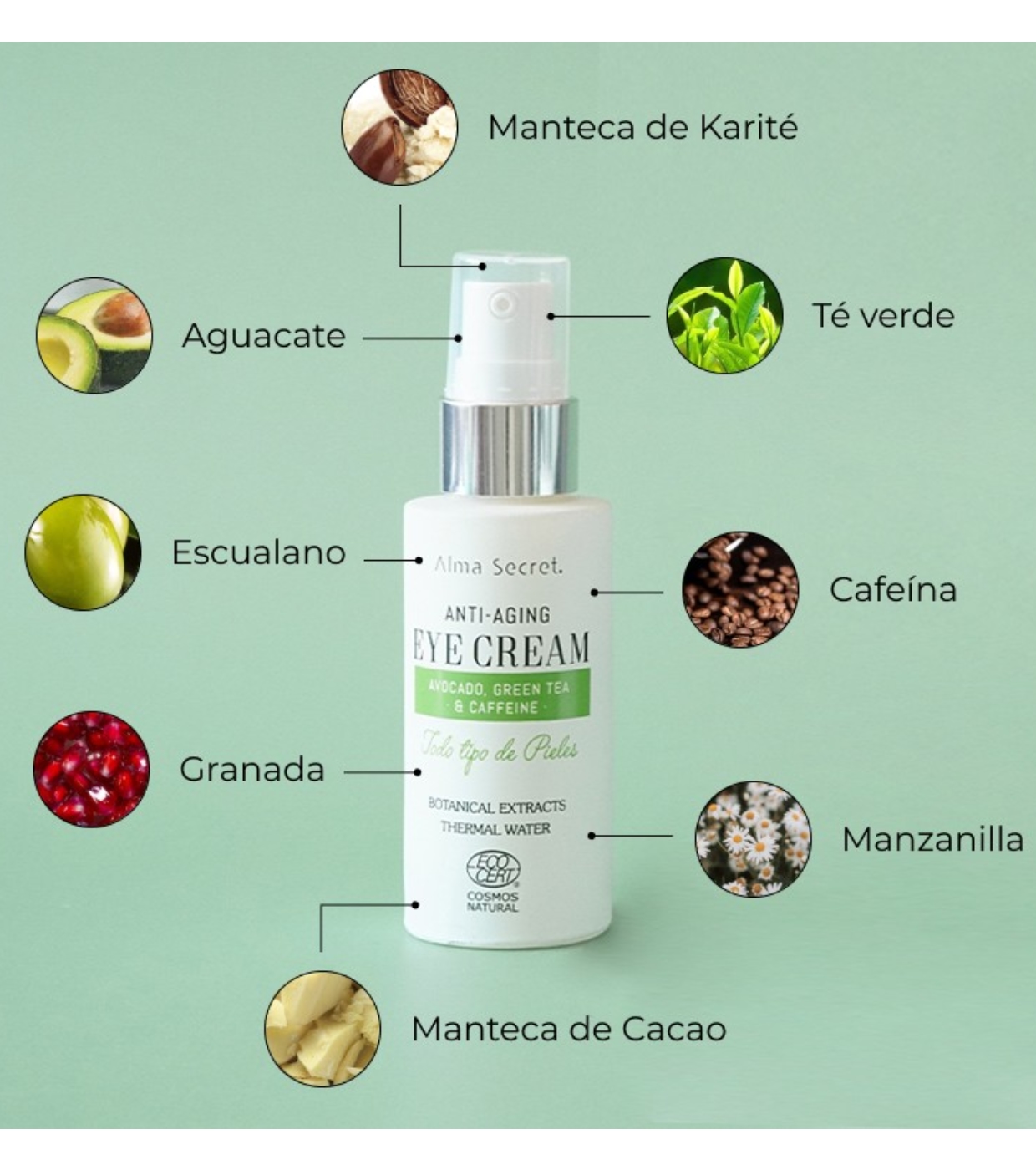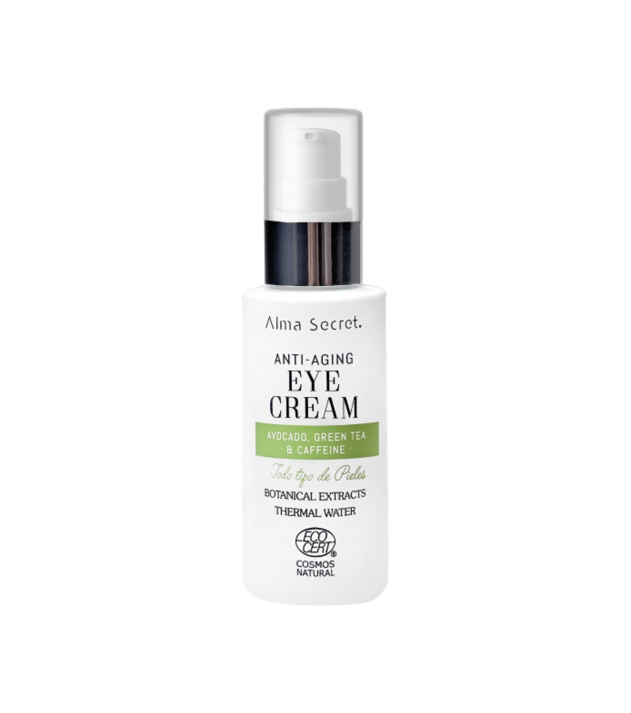 The multi-repairing and anti-aging eye contour cream with avocado, green tea and caffeine from Alma Secret has a powerful natural formula to combat the signs of aging and tiredness around the eyes.