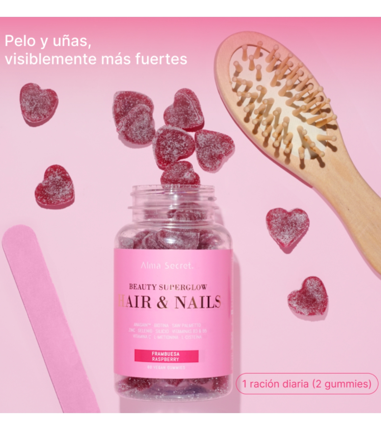 Edulcorante: Jarabe de maltitol; agua osmotizada, edulcorantes sorbitol, maltitol plv; L-Metionina, L-Cisteína, espesante: pectina; E.S de brotes de guisantes en polvo - AnaGainTM Un (Pisum sativum, Brotes orgánicos, Isomaltosa), E.S. Acerola [(Malpighia punicifolia L., fruto, Maltodextrina), 25% Vitamina C], E.S. Bambú [(Bambusa arundinacea (Retz.) Willd, Brote (tallos florales, hojas y tallo principal), Maltodextrina) 70% silice] E.S. Saw Palmetto (Serenoa repens, baya, maltodextrina), Acidulante: ácido cítrico; Aroma natural, Aroma natural (Edulcorante), Vitamina B3 (Nicotinamida), Colorante (concentrados de frutas y vegetales), Acidulante: citrato de sodio; Citrato de zinc, Edulcorante: Sucralosa, Vitamina B5 (D-Pantotenato cálcico), Vitamina B8 (Biotina), Selenio (Selenito de sodio). Recubrimiento: edulcorante: maltitol plv. Contiene edulcorantes.