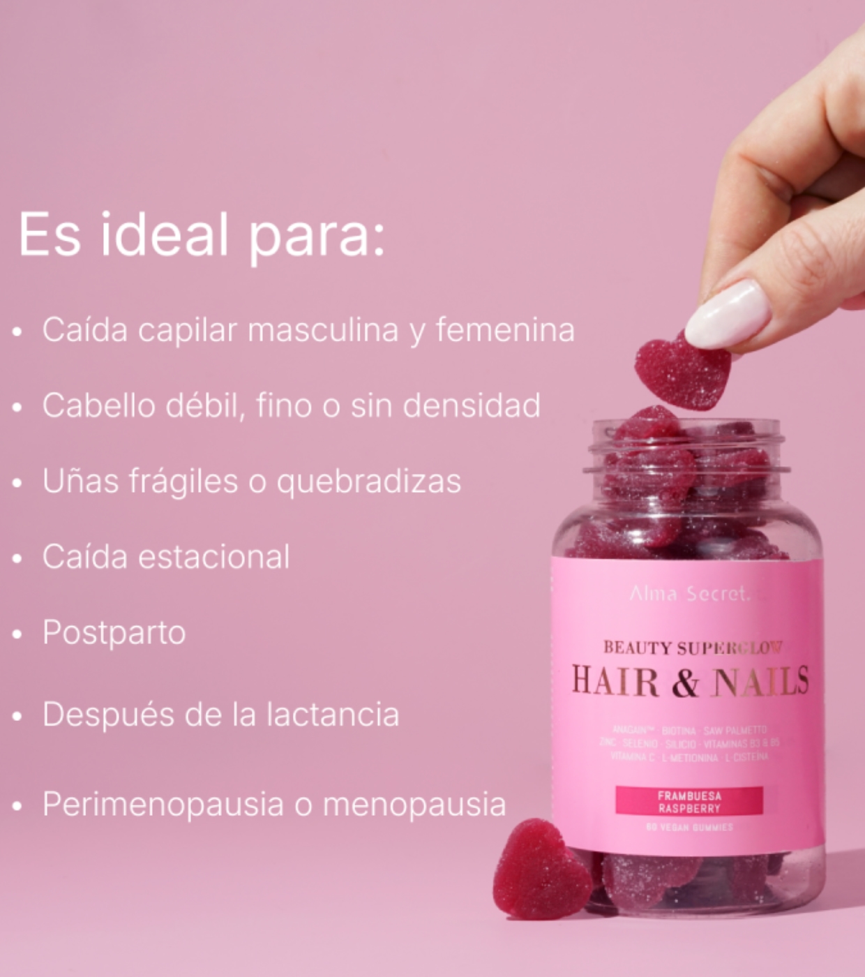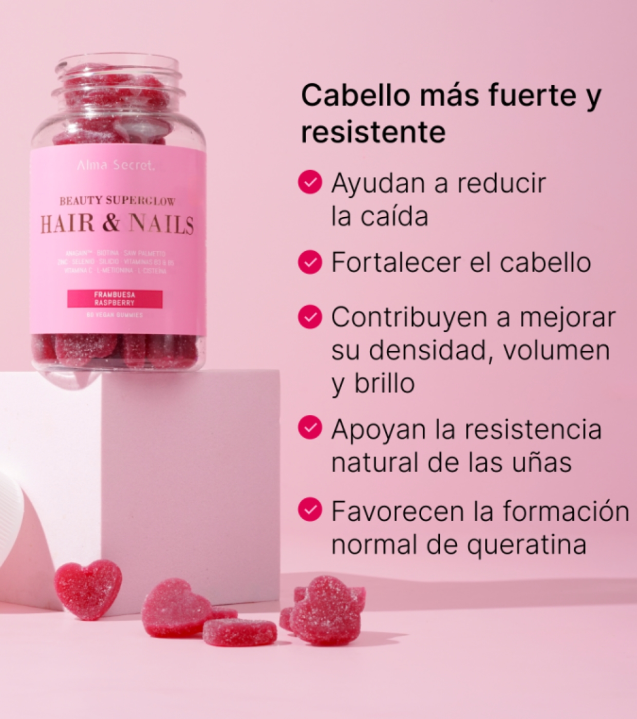 Get stronger hair and more resistant nails with these gummies from Alma Secret formulated with 11 carefully selected natural active ingredients to work in synergy.
