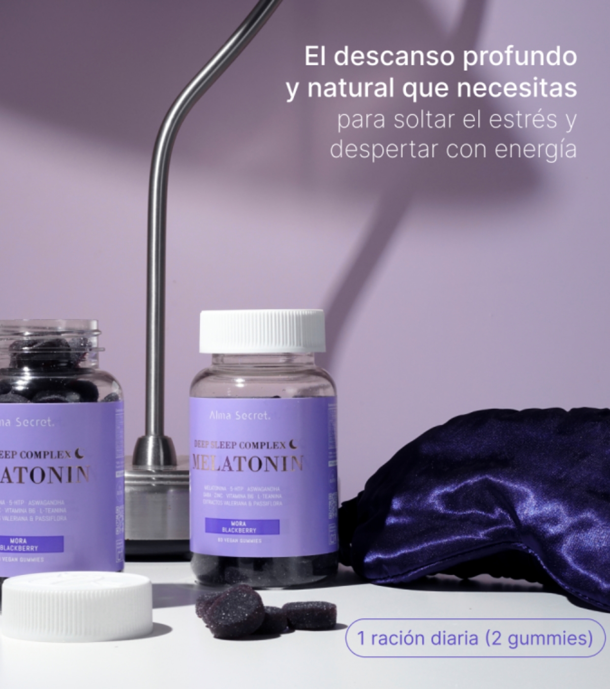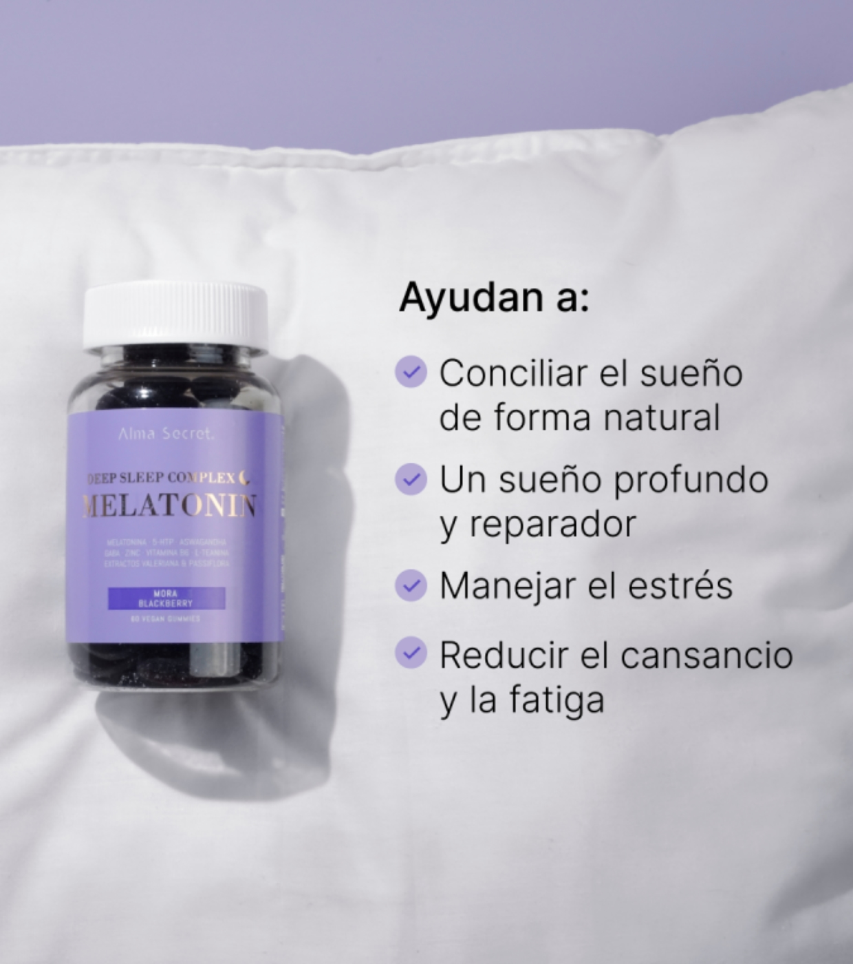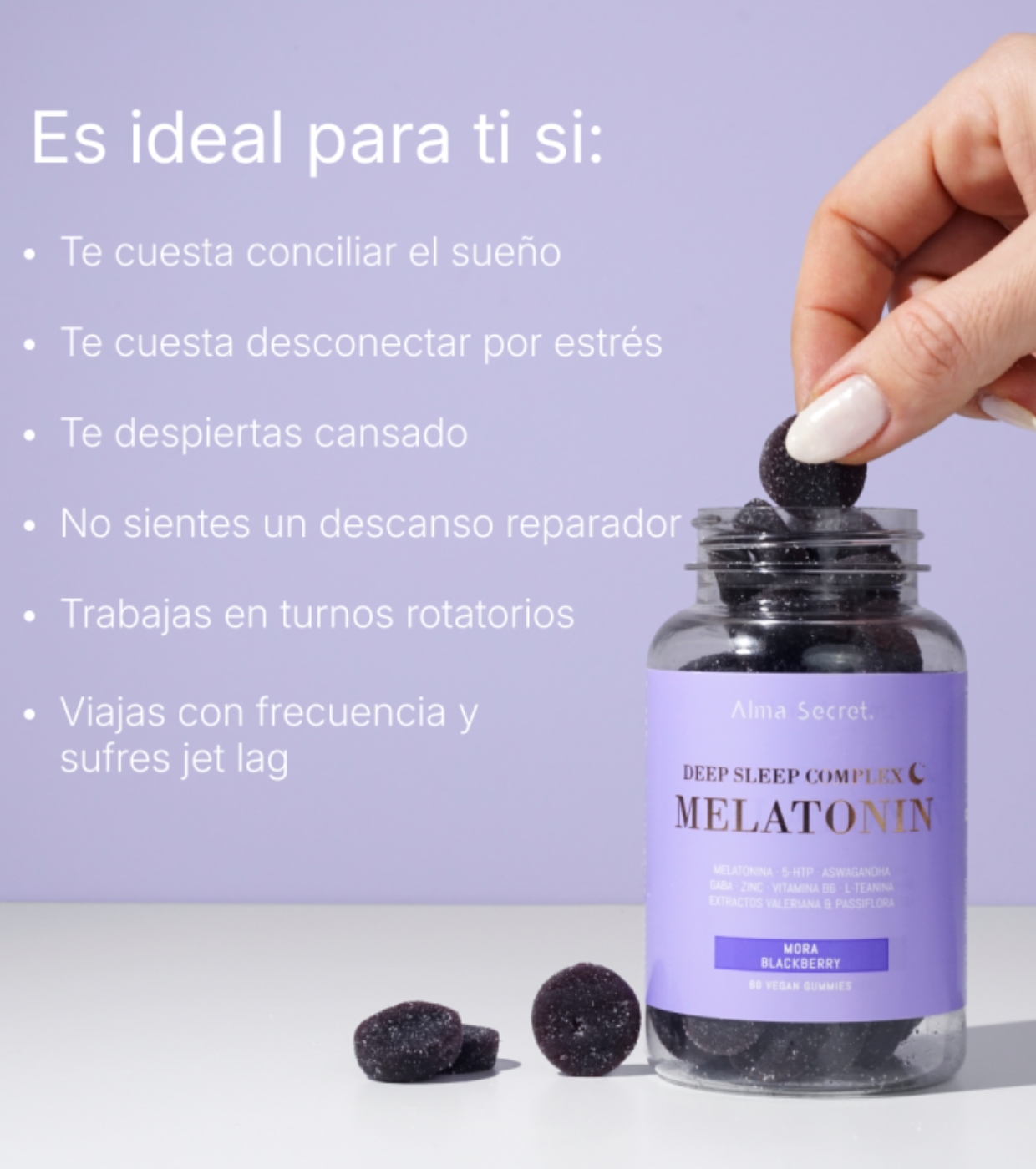 Enjoy the deep rest you need with these gummies from Alma Secret formulated with 9 natural active ingredients that work in synergy to promote relaxation, help you fall asleep and improve your sleep quality.