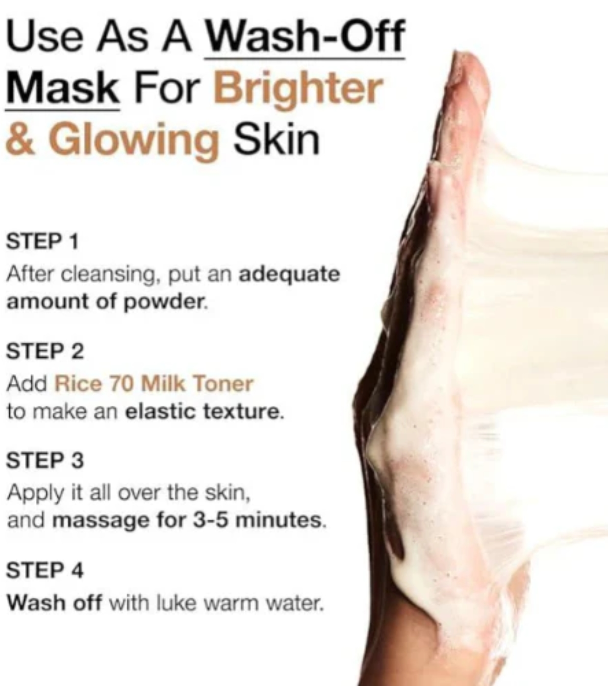 For face mask: Mix the powder with 1-1.5 teaspoons of water until you get a stretchy consistency. Apply evenly on the skin and massage for 3-5 minutes. Then rinse with warm water.
