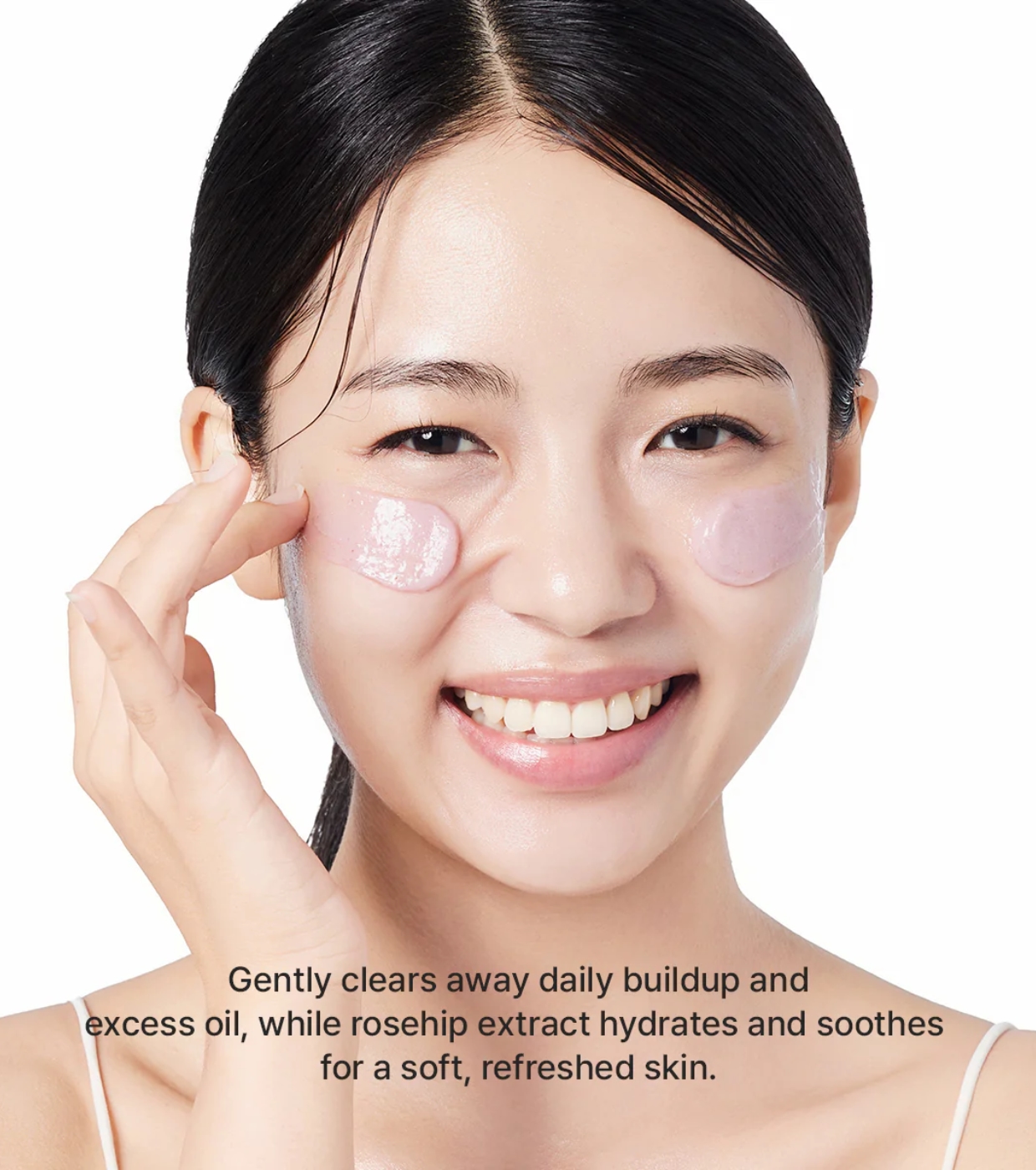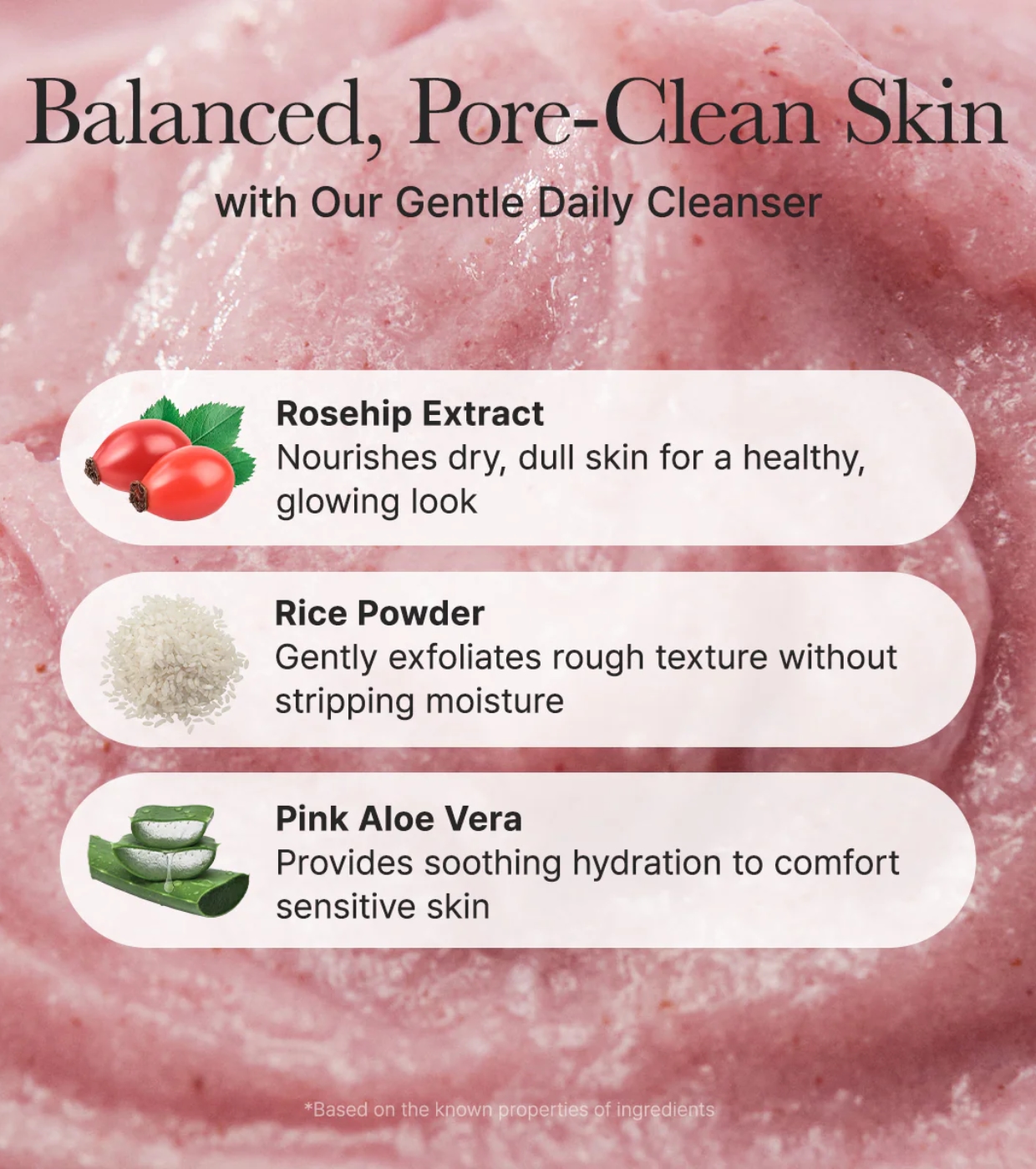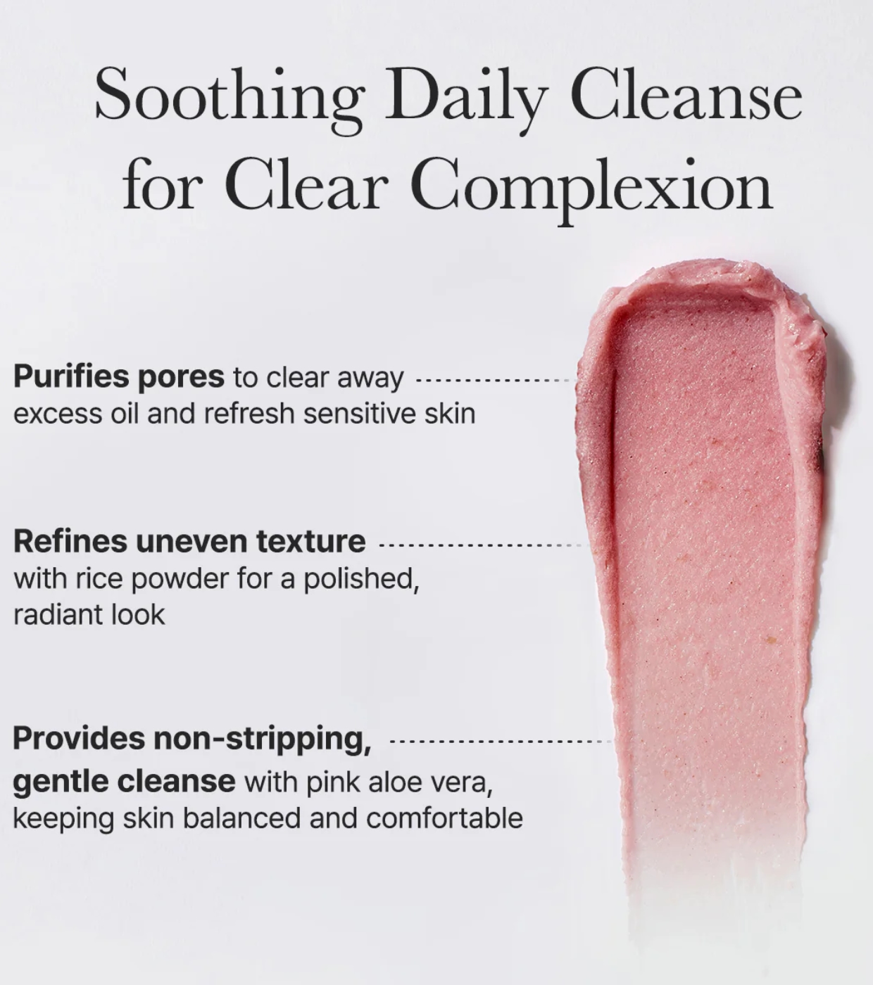Its formula combines fermented rice, rosehip and pink aloe, a synergy of ingredients that effectively cleanses without compromising the skin barrier.