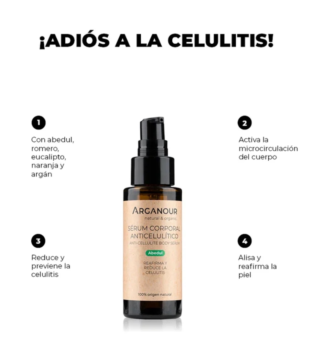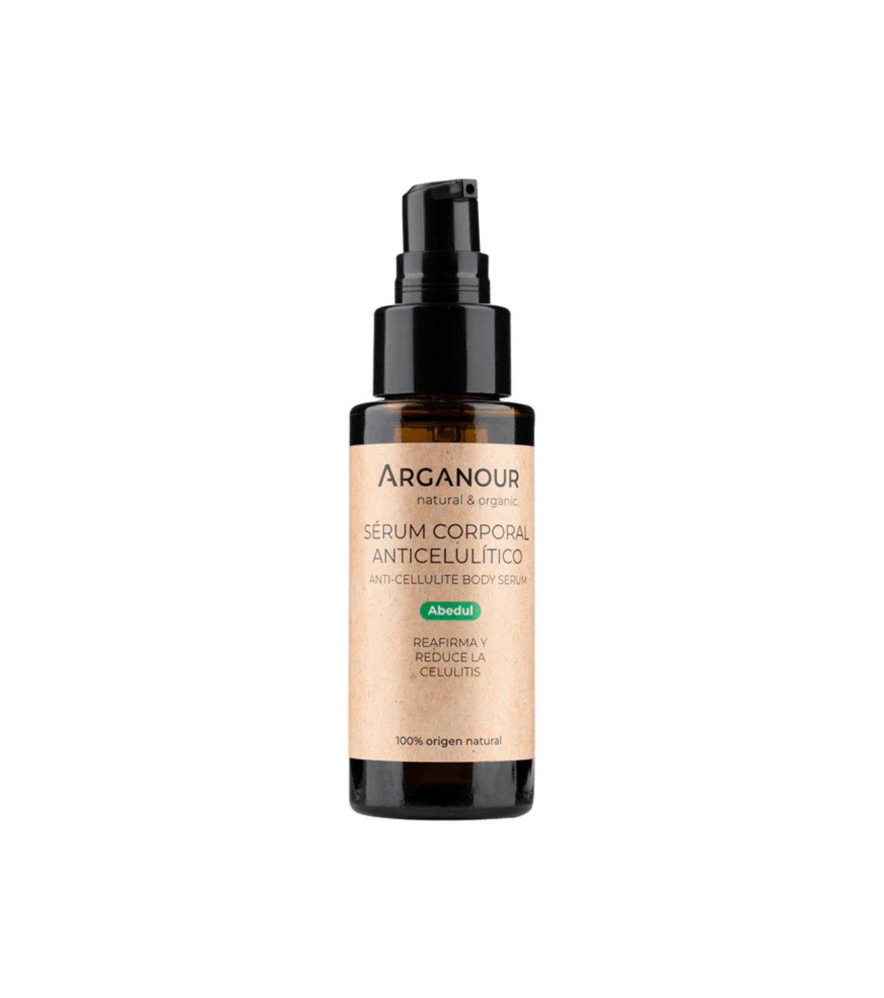 Arganour's anti-cellulite body serum is a treatment with birch, rosemary, eucalyptus, orange, and argan oils that helps activate the skin's metabolism, promoting fat mobilization and microcirculation.