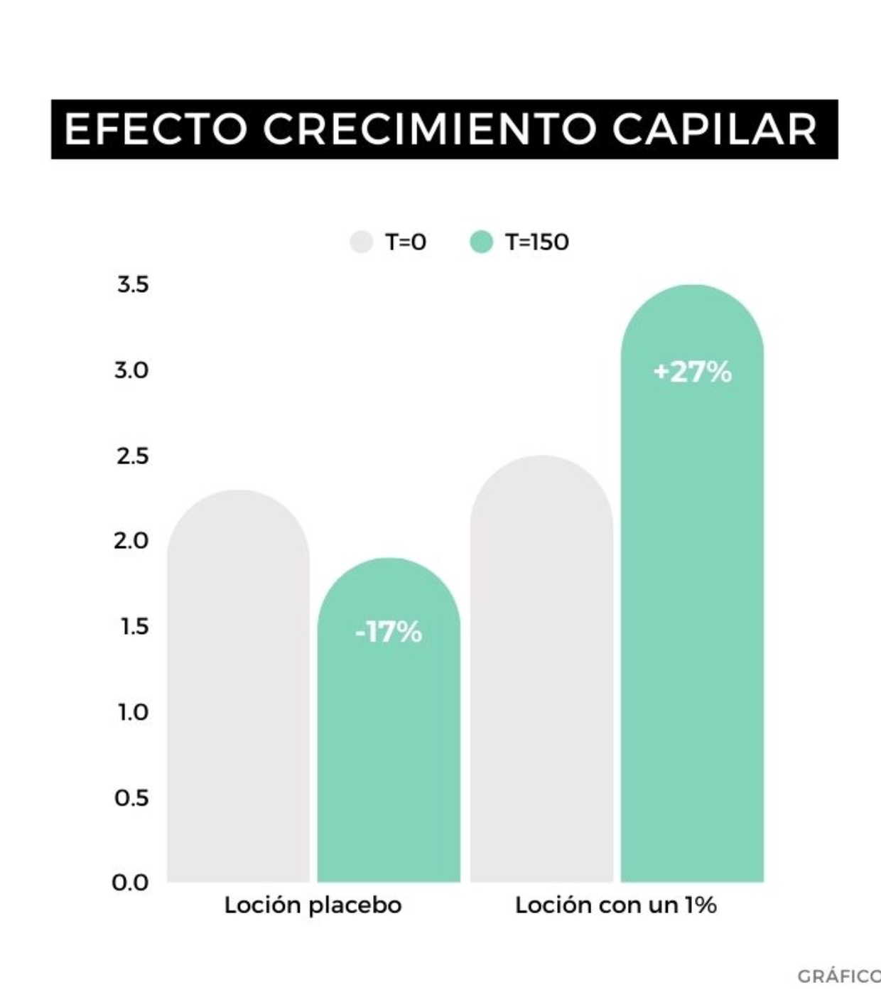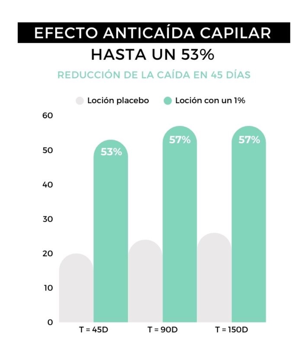 Improves the quality and density of hair, delaying hair loss thanks to its anti-hair loss effect, which reduces hair loss by 53% after 45 days, and its regenerative effect, increasing hair density by up to 52% in 150 days.