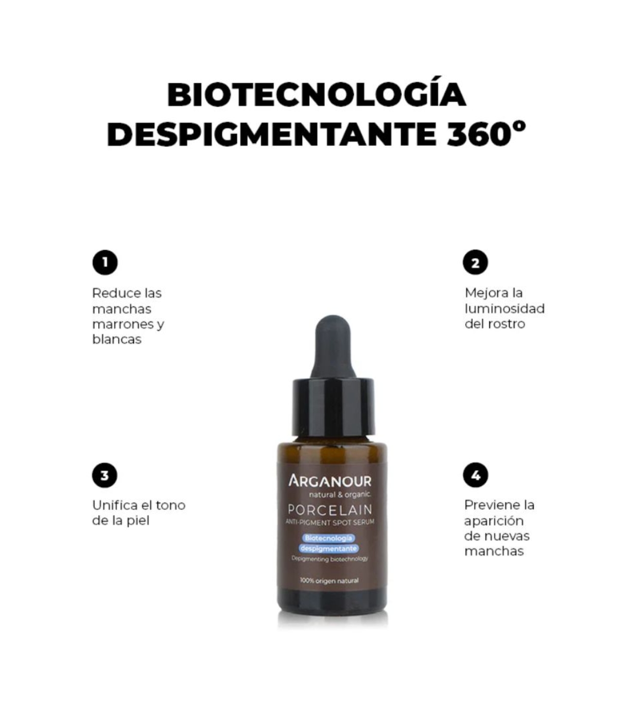 Porcelain is the only 100% natural depigmenting serum that acts on all types of spots: acne marks, sun spots, hormonal spots or melasma, age spots...