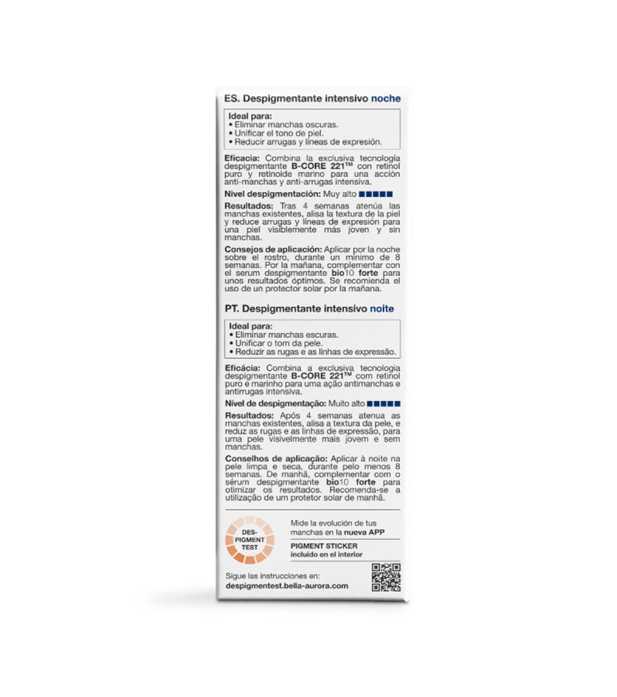 It combines the exclusive B-CORE 221™ depigmenting technology with pure retinol and marine retinoid for an intensive anti-spot and anti-wrinkle action.