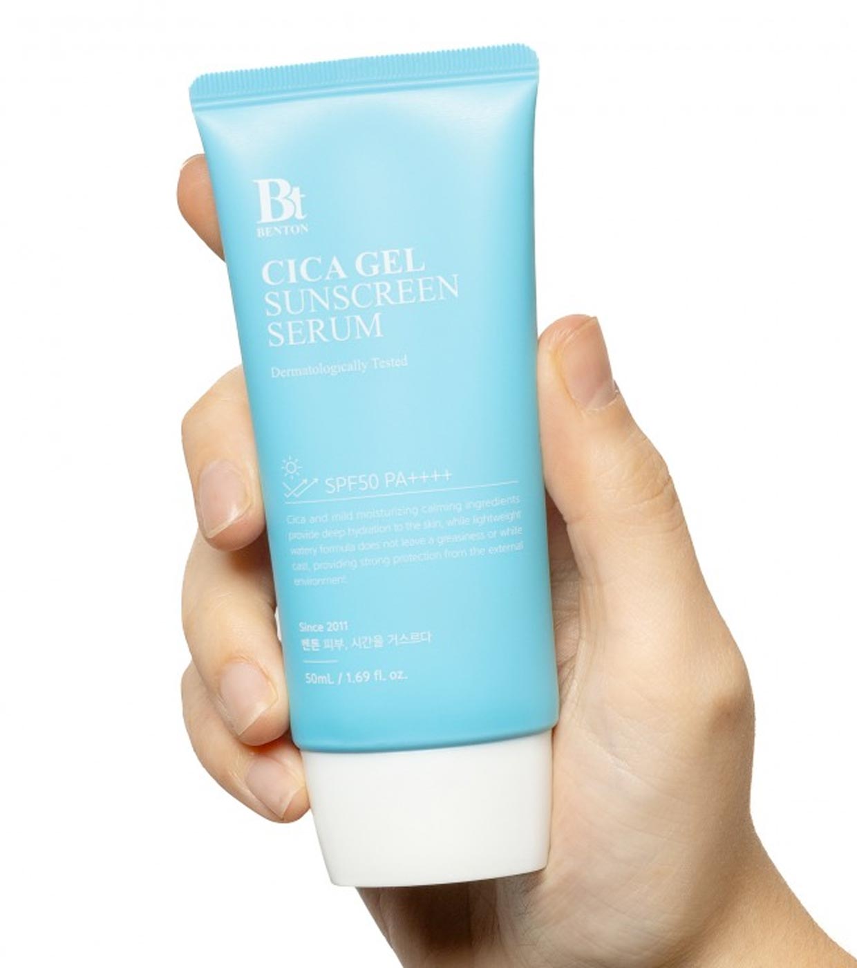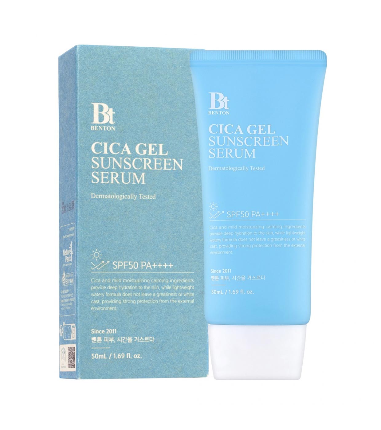 Moisturizing and soothing sunscreen serum SPF50+ Cica Gel by Benton.