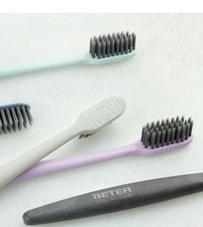 A sustainable and recyclable toothbrush with a handle made from wheat fibers.