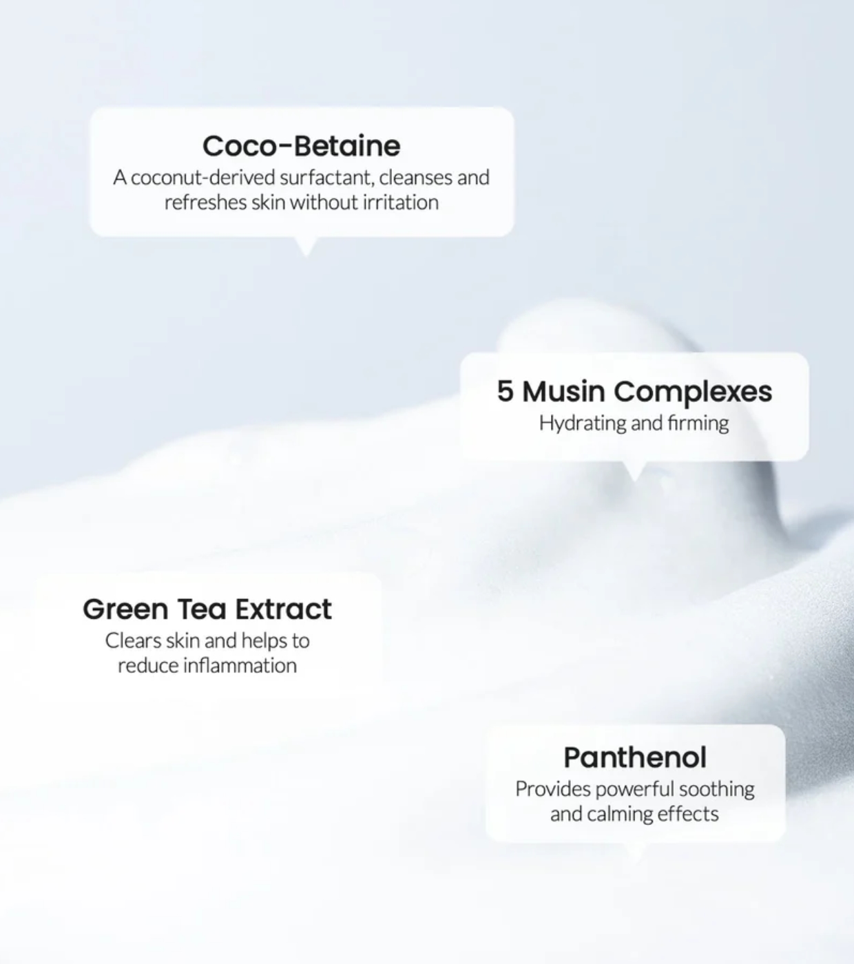 - Complex of 5 types of mucin: reinforces hydration, improves elasticity and soothes irritations.