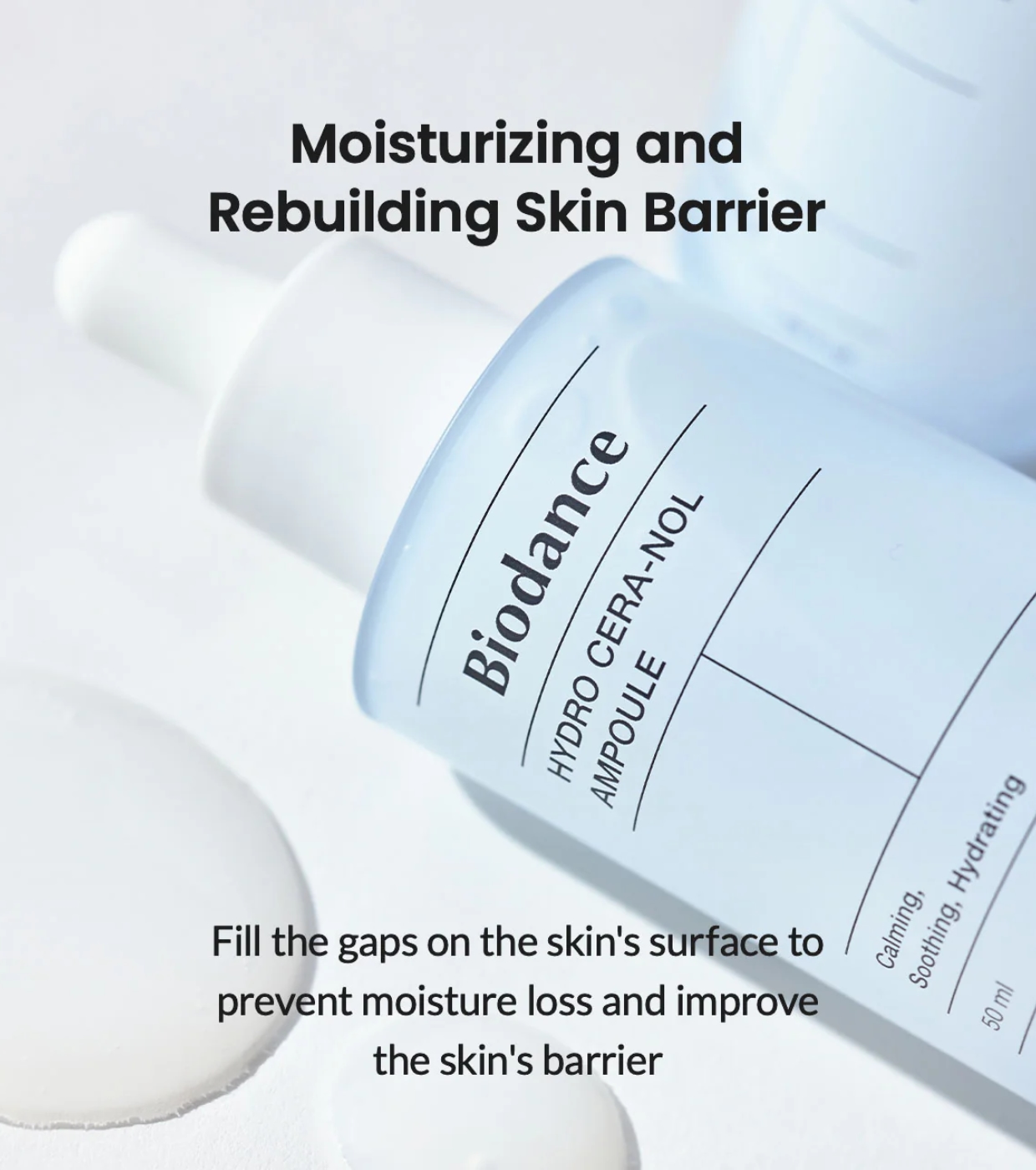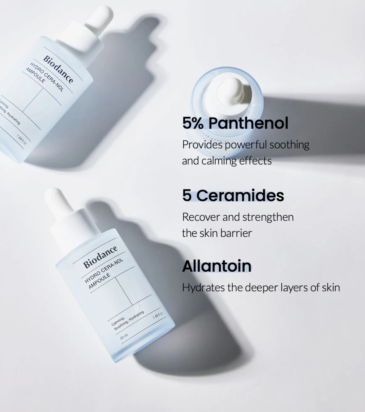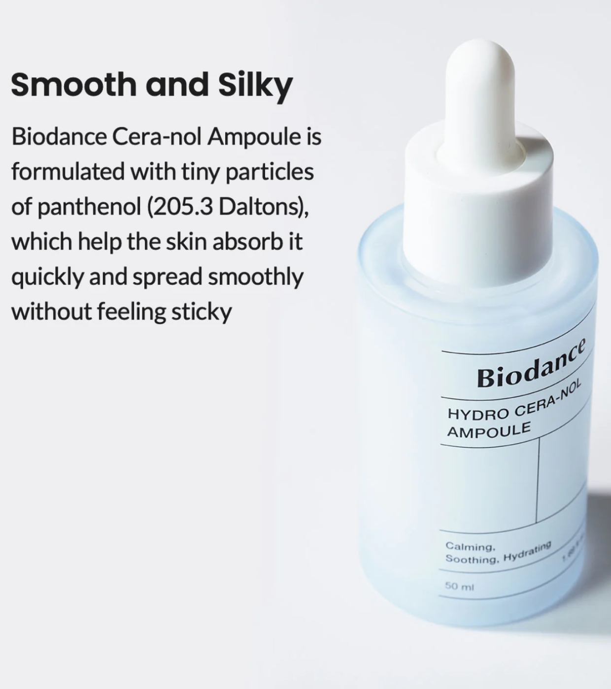 Soothe, hydrate and strengthen your skin with Biodance Hydro Cera-nol Ampoule , an advanced formula that combines low molecular weight panthenol, multi-layered ceramides and hyaluronic acid to restore the skin barrier and provide deep hydration, without leaving a sticky feeling.