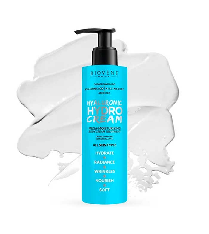 Biovène body moisturizer with hyaluronic acid and organic avocado that intensely nourishes the skin to help restore its protective barrier and immediately restore silky softness to the touch.
