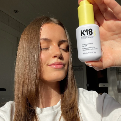 K18 molecular repair hair oil: Acts on the hair to strengthen it, repairing damage and reducing frizz at two levels of the hair fiber and improving shine.
