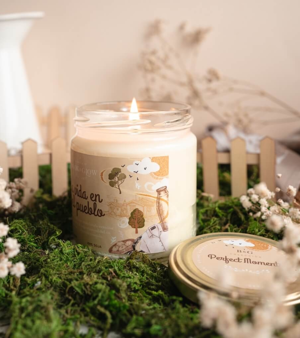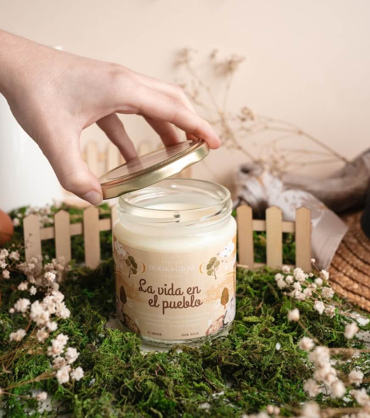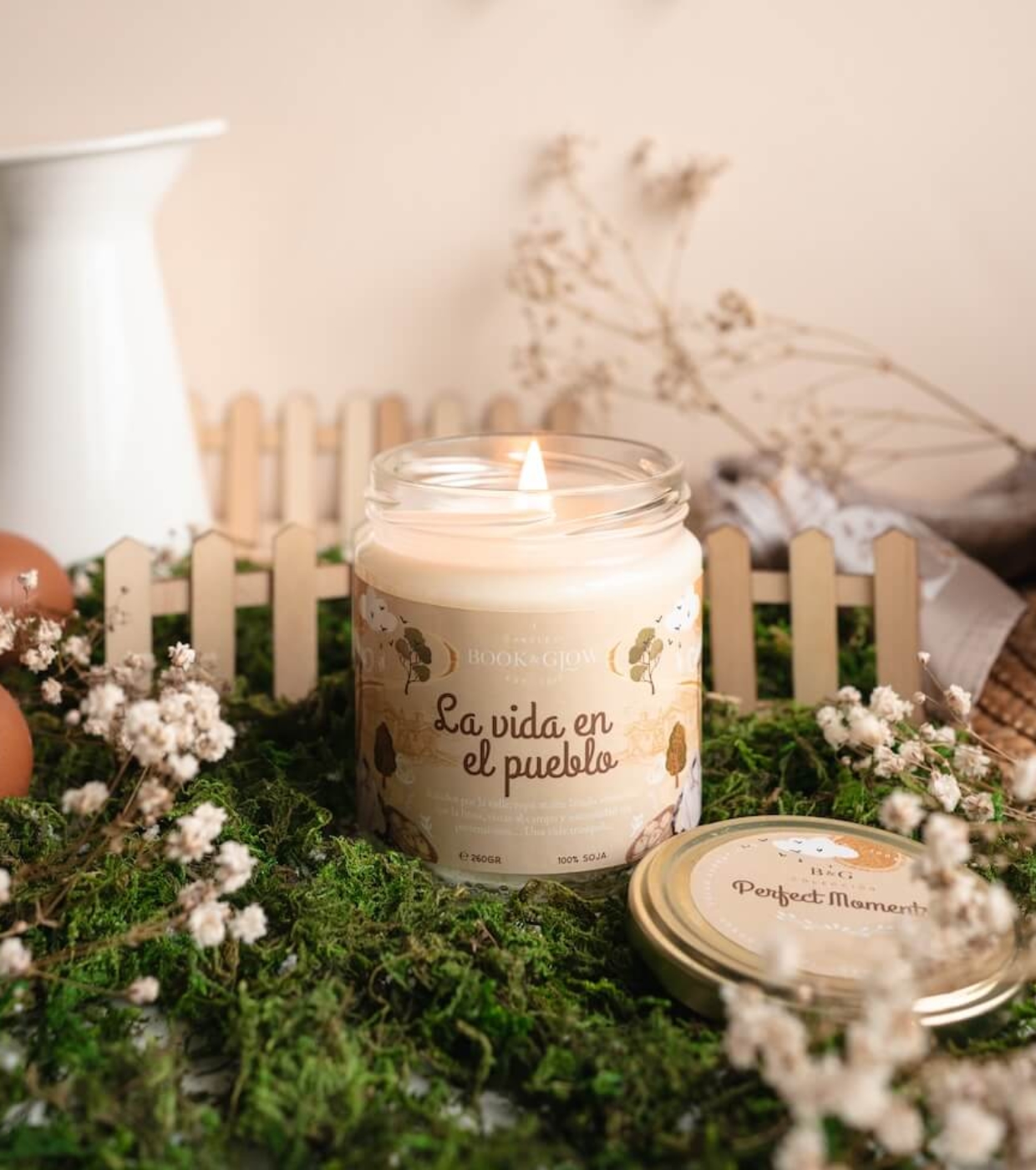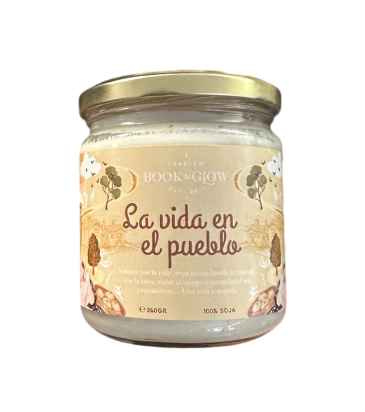 Let yourself be enveloped by the essence of a slow and authentic summer with the Book and Glow Village Life soy candle .