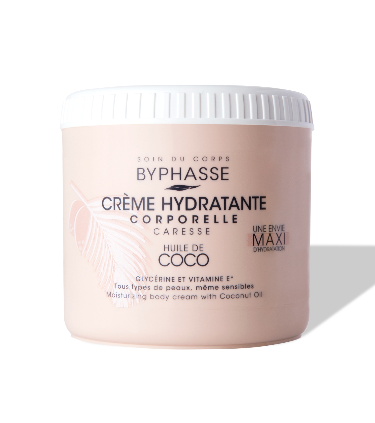 The moisturizing body cream with coconut oil in 500 ml format, formulated with glycerin, shea butter and enriched with vitamin E, hydrates the skin.