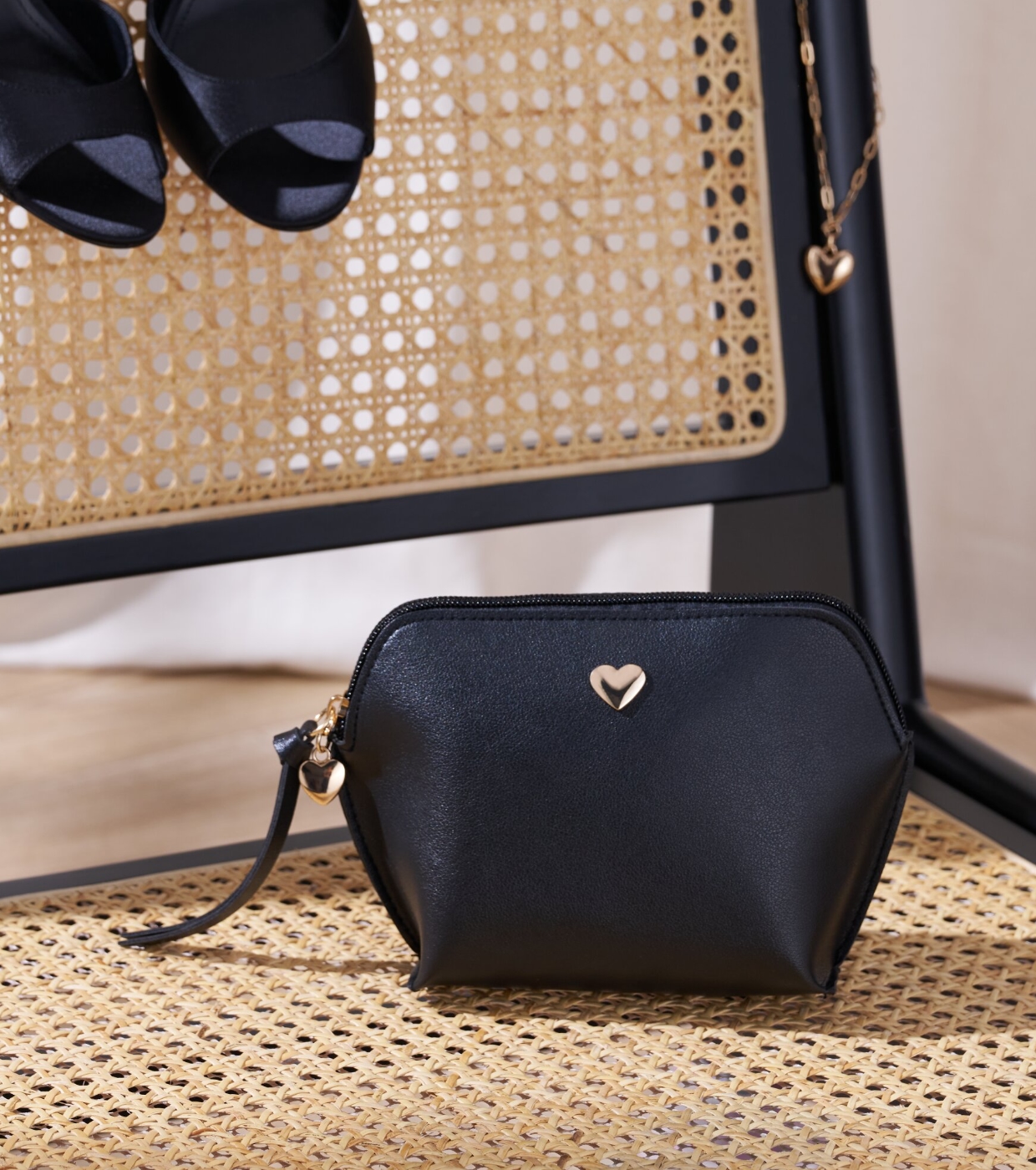 Its black leather-effect finish is combined with gold details, such as the delicate metallic heart on the front and the heart-shaped charm handle, adding a romantic and sophisticated touch.
