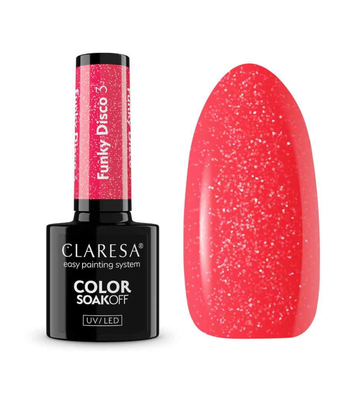 Claresa's Funky Disco collection includes 7 semi-permanent polishes in vibrant shades of pink, orange, yellow, green, blue and purple, all adorned with thousands of shiny particles.