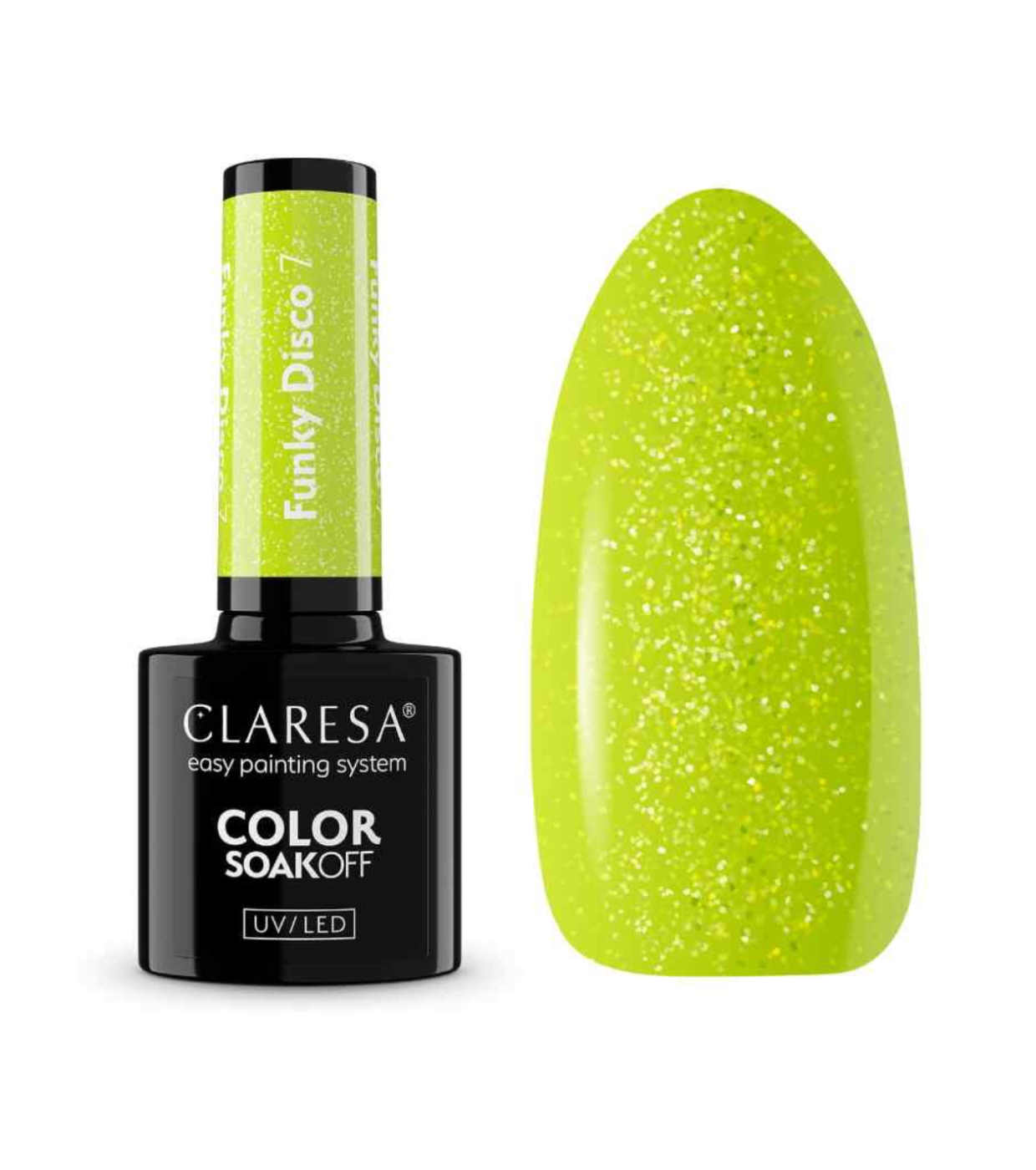 Claresa's Funky Disco collection includes 7 semi-permanent polishes in vibrant shades of pink, orange, yellow, green, blue and purple, all adorned with thousands of shiny particles.