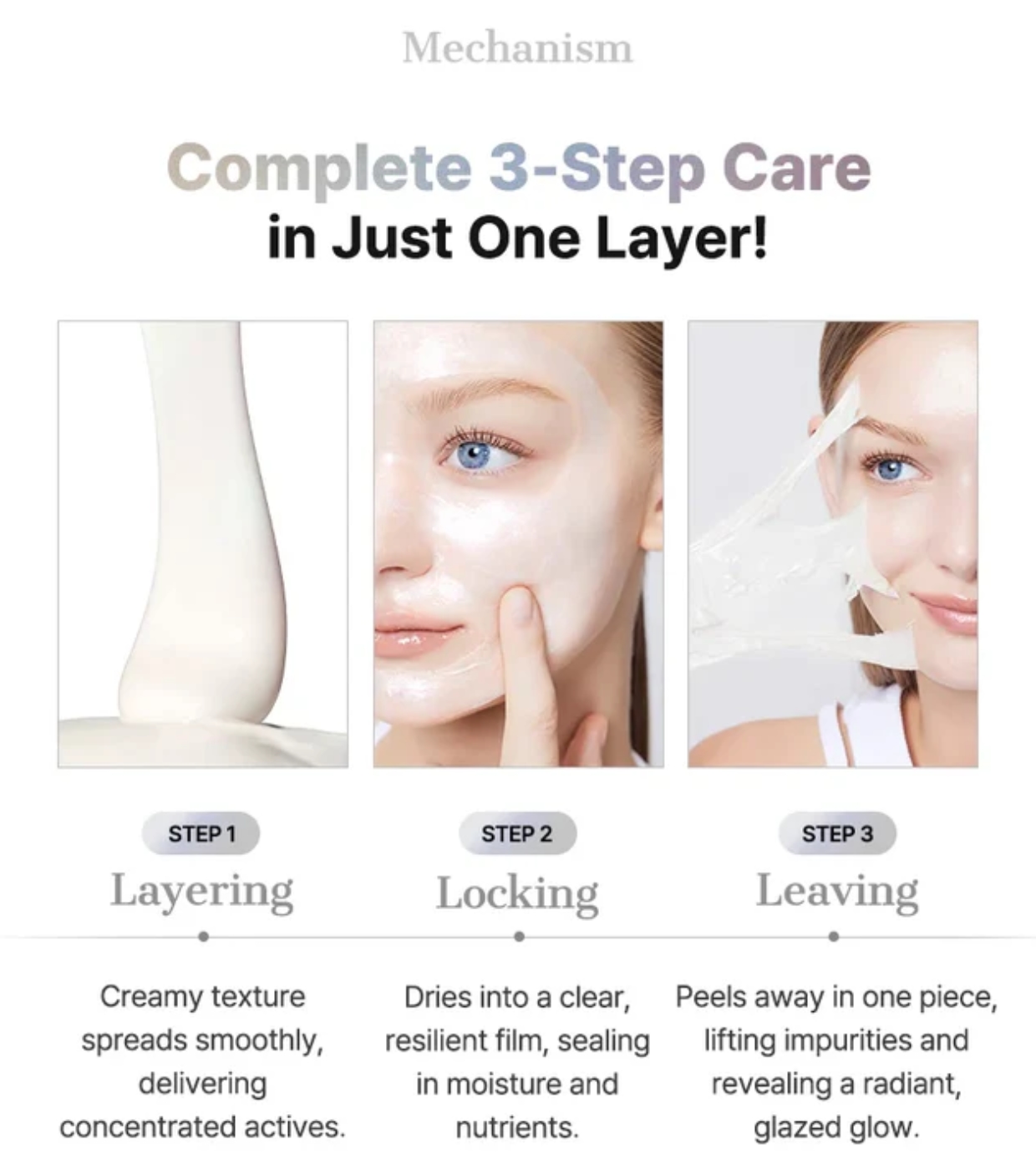 When applied, it spreads in an even layer that, upon drying, transforms into a transparent peel-off film. When removed, the skin feels smoother, more hydrated, and visibly brighter, without leaving a sticky residue.