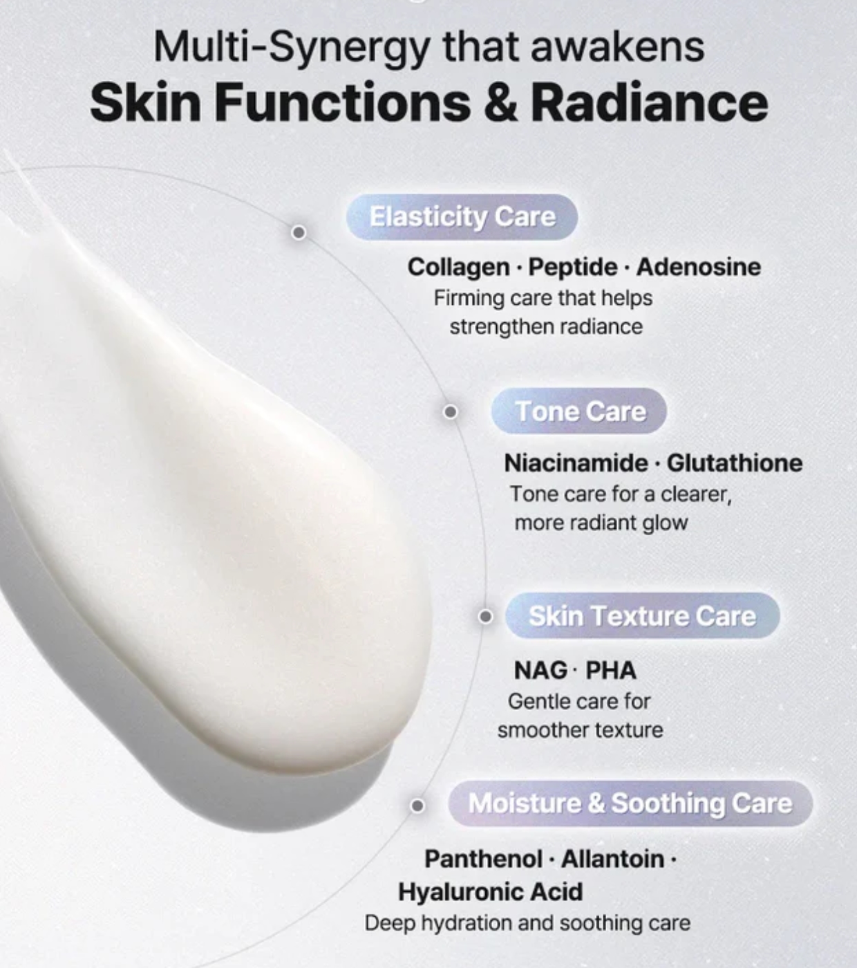 Aqua/Water, Polyvinyl Alcohol, Octyldodecanol, Methylpropanediol, Butylene Glycol, Niacinamide, Caprylic/Capric Triglyceride, 1,2-Hexanediol, Algin, Polysorbate 80, Pentaerythrityl Tetraethylhexanoate, Pullulan, Simmondsia Chinensis Seed Oil, Polyglyceryl-10 Oleate, Glyceryl Stearate, PEG-100 Stearate, Titanium Dioxide, Disteardimonium Hectorite, Synthetic Fluorphlogopite, Mica, Microcrystalline Cellulose, Ethylhexylglycerin, Sphingomonas Ferment Extract, Adenosine, Cellulose Gum, Sodium Phytate, Sodium DNA, Tin Oxide, Glutathione, Acetyl Glucosamine, Allantoin, Panthenol, Hydrolyzed Collagen, Gluconolactone, Mannitol, Centella Asiatica Leaf Extract, Glycerin, Lactobacillus Extracellular Vesicles, Hydrated Silica, Citric Acid, Sodium Hyaluronate, Caprylyl Glycol, Acetyl Hexapeptide-8.