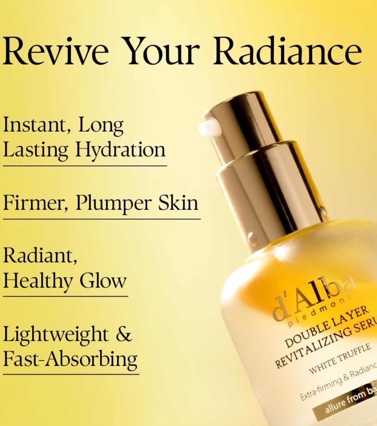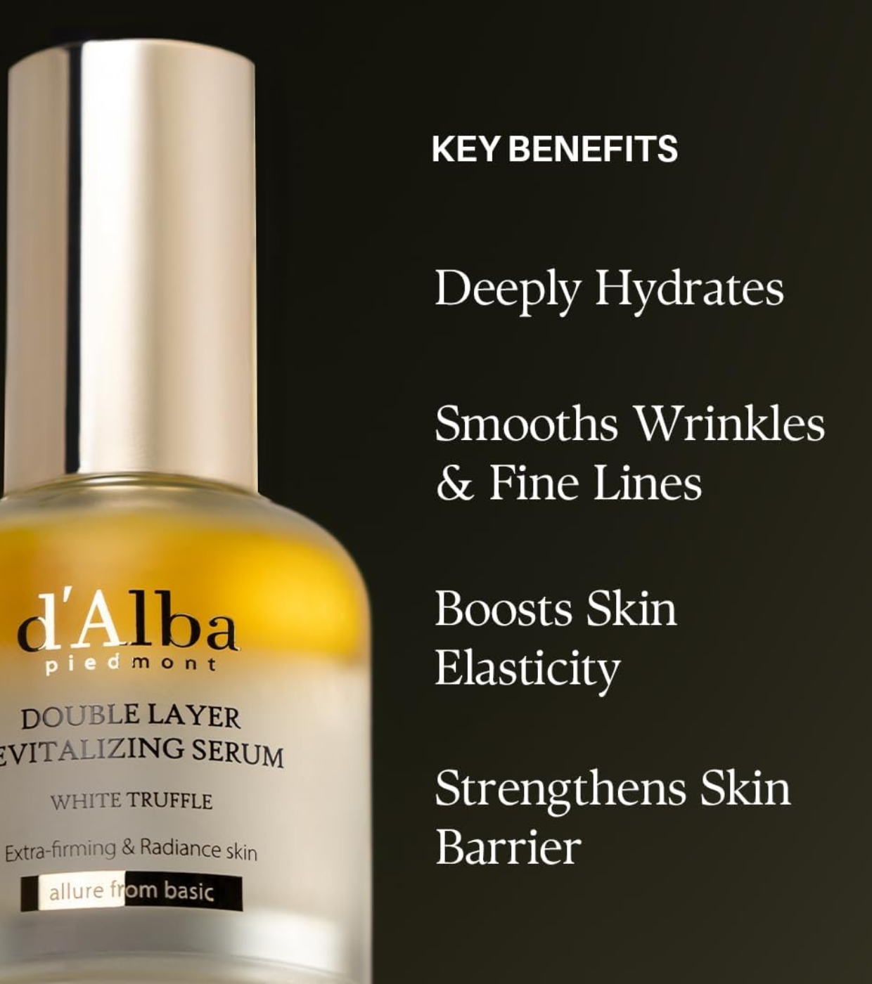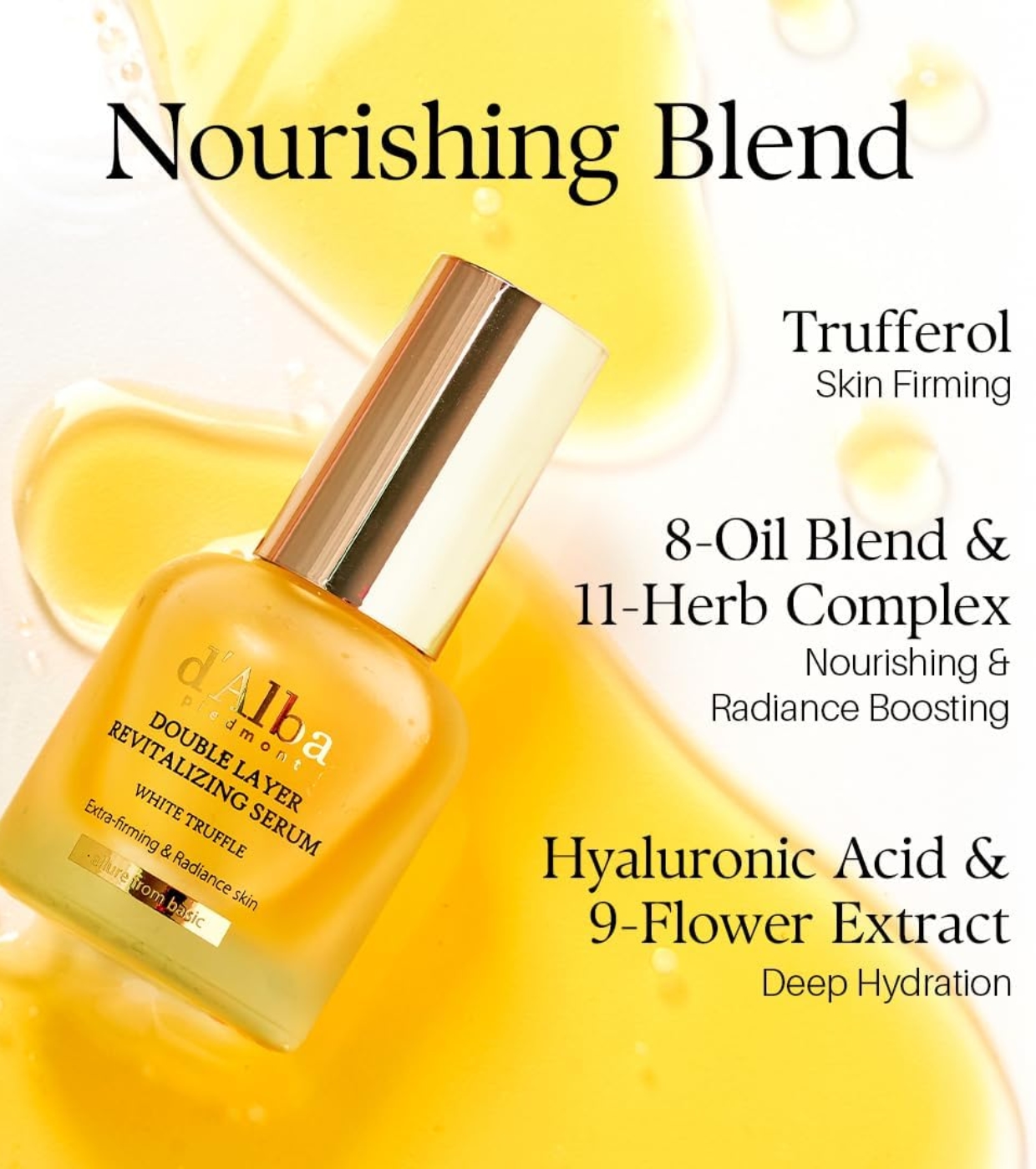 D’Alba White Truffle Double Layer Revitalizing Serum is a 2-in-1 revitalizing serum that combines 70% lightweight essence with 30% nourishing oils to transform skin with every application.