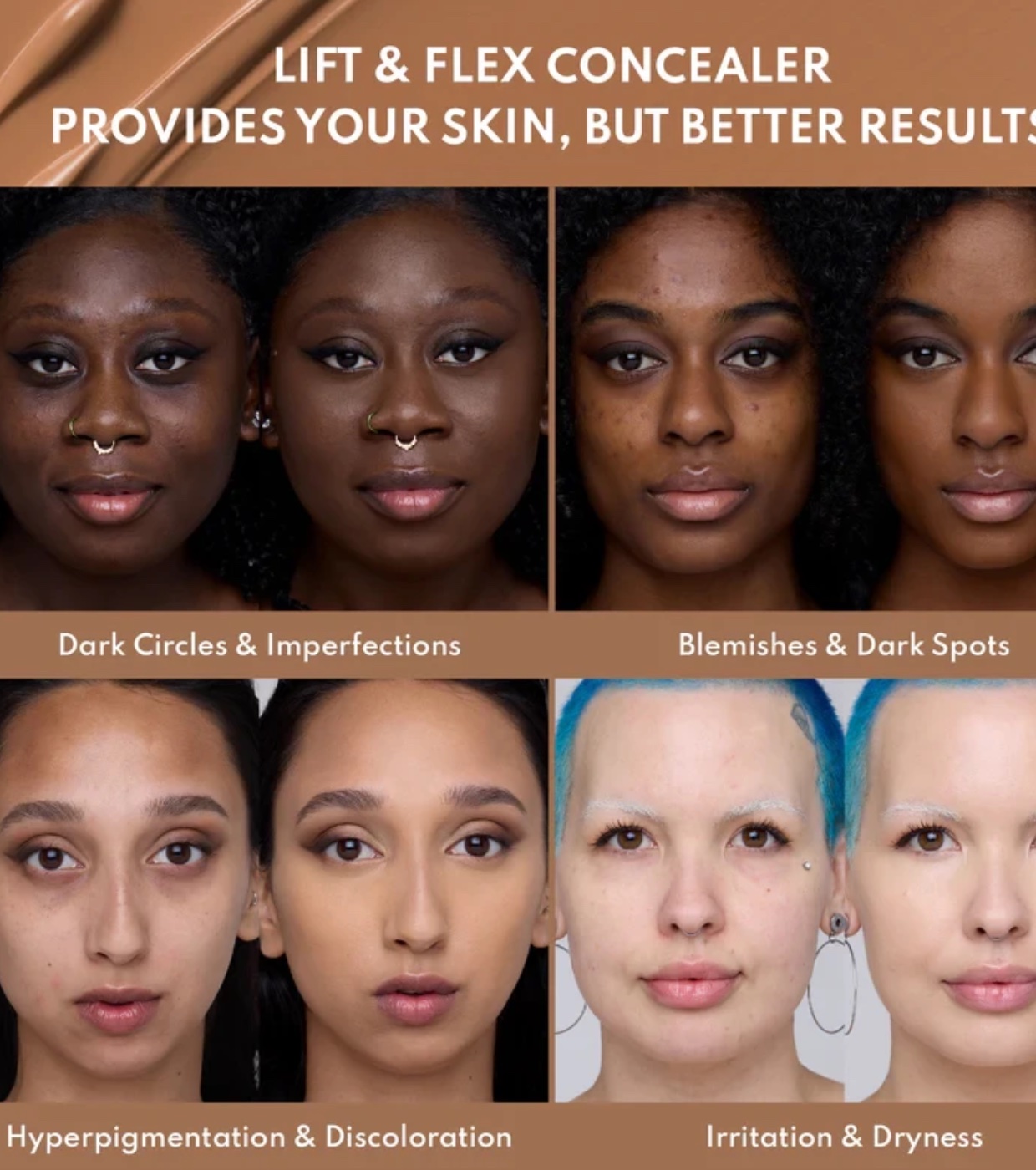 Lift and Flex Concealer's shade range is flexible and adapts to any skin tone, addressing various correction needs.