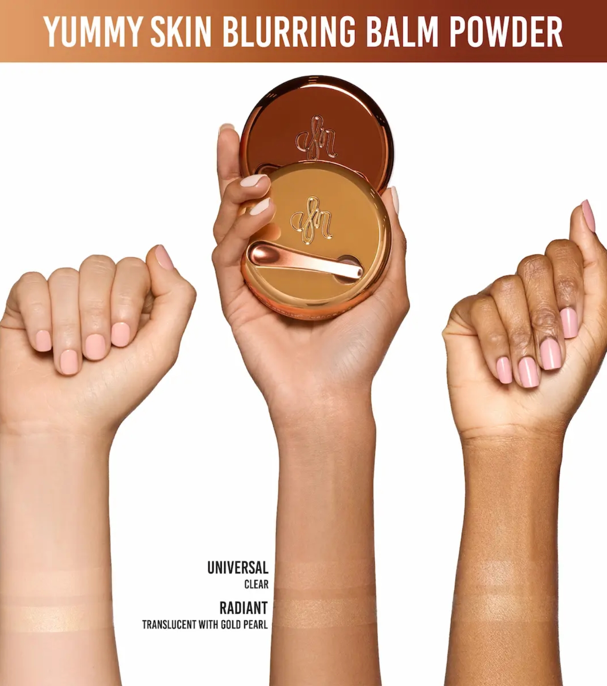 As a primer: Using either the universal shade or a tinted shade, apply Yummy Skin Blurring Balm Powder to prep both face and eyelids.