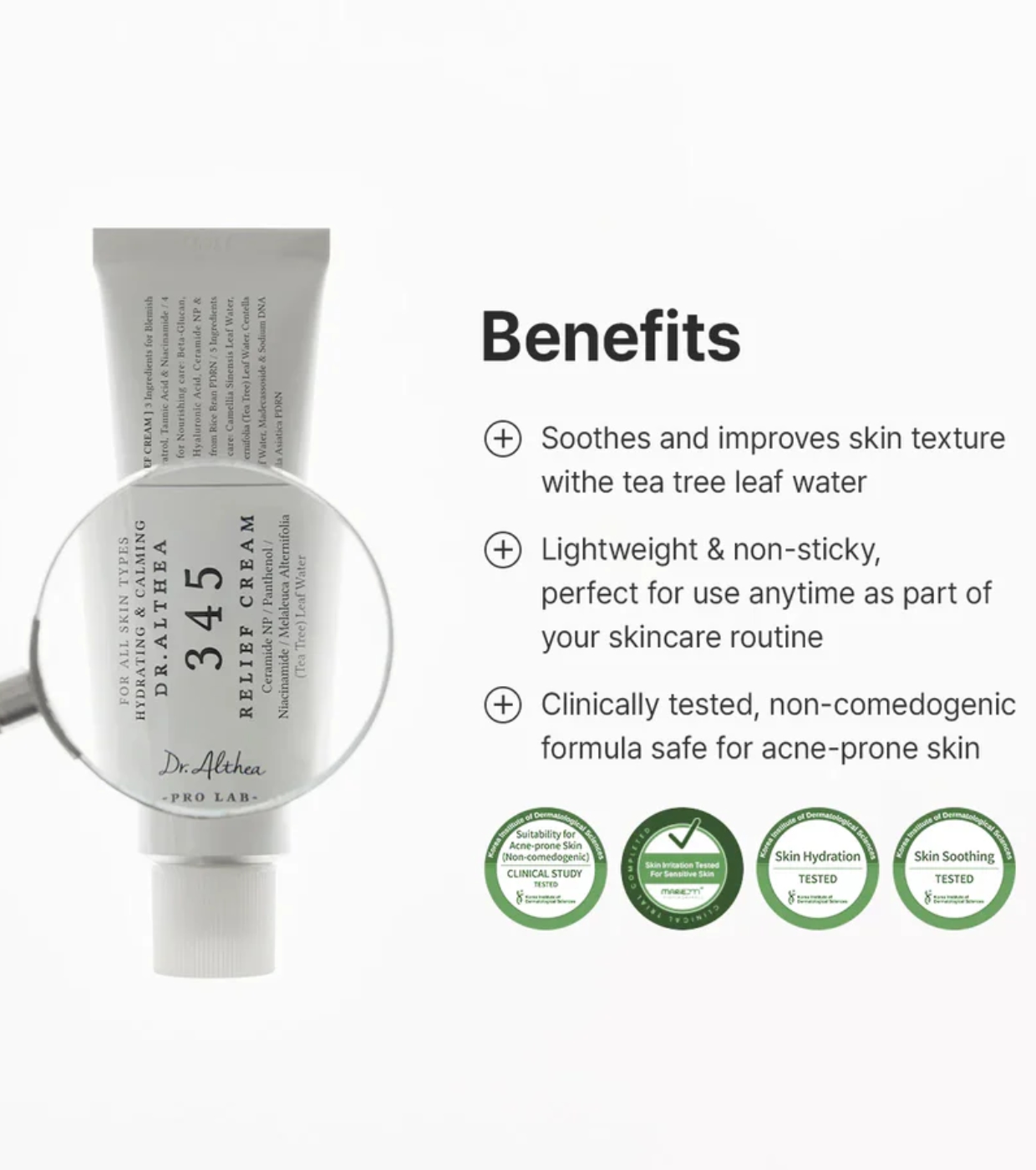 Dr. Althea 345 Relief Cream is a complete solution for skin that needs repair, soothing, and hydration without irritation, ideal for accompanying recovery processes after acne or extreme sensitivity.