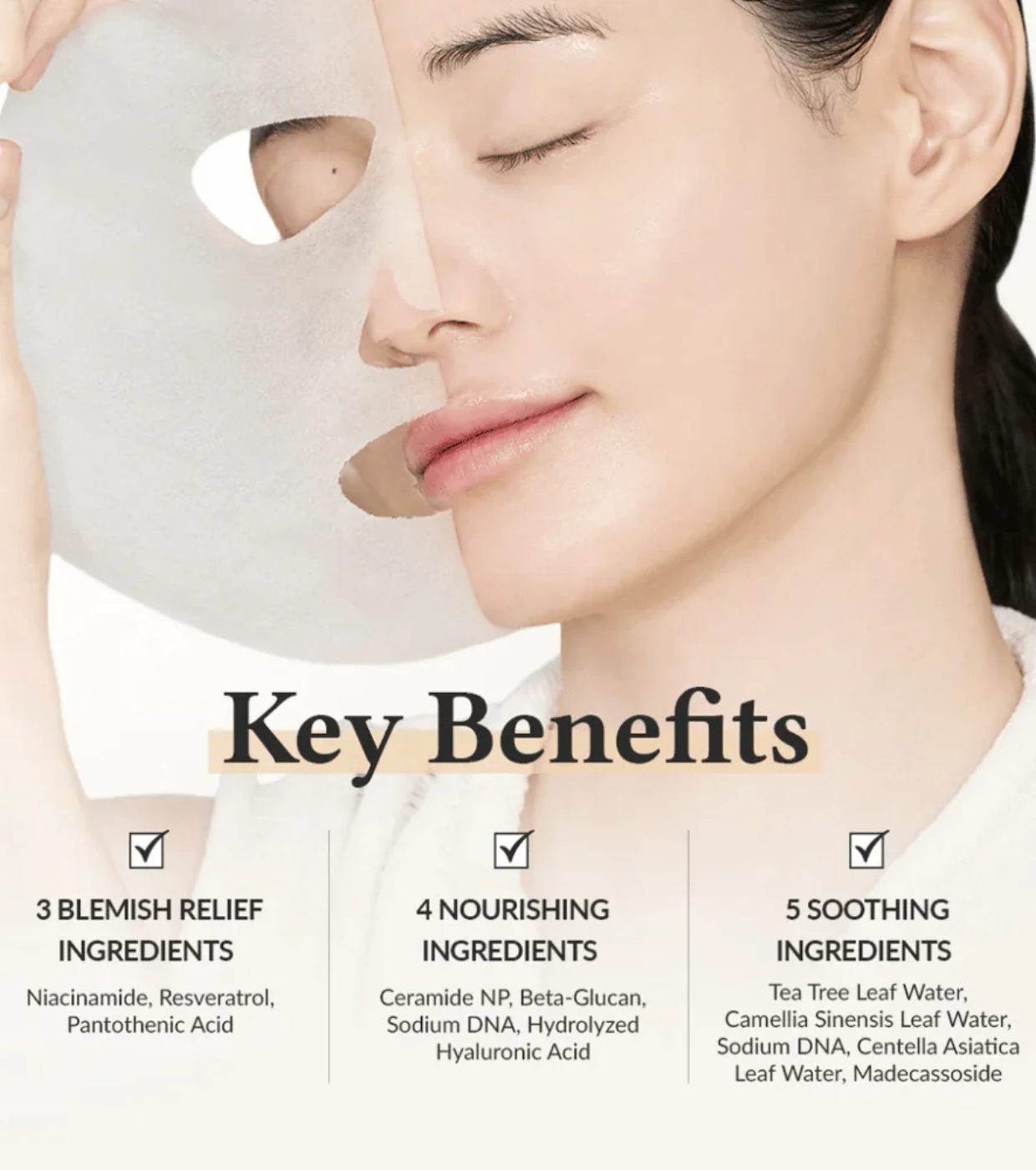 Aqua (Water), Tea Tree Leaf Water, Methylpropanediol, 1,2-Hexanediol, Butylene Glycol, Glycerin, Niacinamide, Octyldodeceth-16, Triethylhexanoin, Caprylic/Capric Triglyceride, Pentylene Glycol, Carbomer, Hydroxyethylcellulose, Tromethamine, Allantoin, Trehalose, Caprylyl Glycol, Ethylhexylglycerin, Dipotassium Glycyrrhizate, Disodium EDTA, Panthenol, Soybean Seed Extract, Sodium Hyaluronate, Hydrolyzed Hyaluronic Acid, Pantothenic Acid, Centella Asiatica Leaf Water, Cyclodextrin, Centella Asiatica Extract, Hydrogenated Lecithin, Madecassoside, Ceramide NP, Cholesterol, Camellia Sinensis Leaf Water, Resveratrol, Beta-Glucan, Sodium DNA, Nelumbo Nucifera Leaf Extract