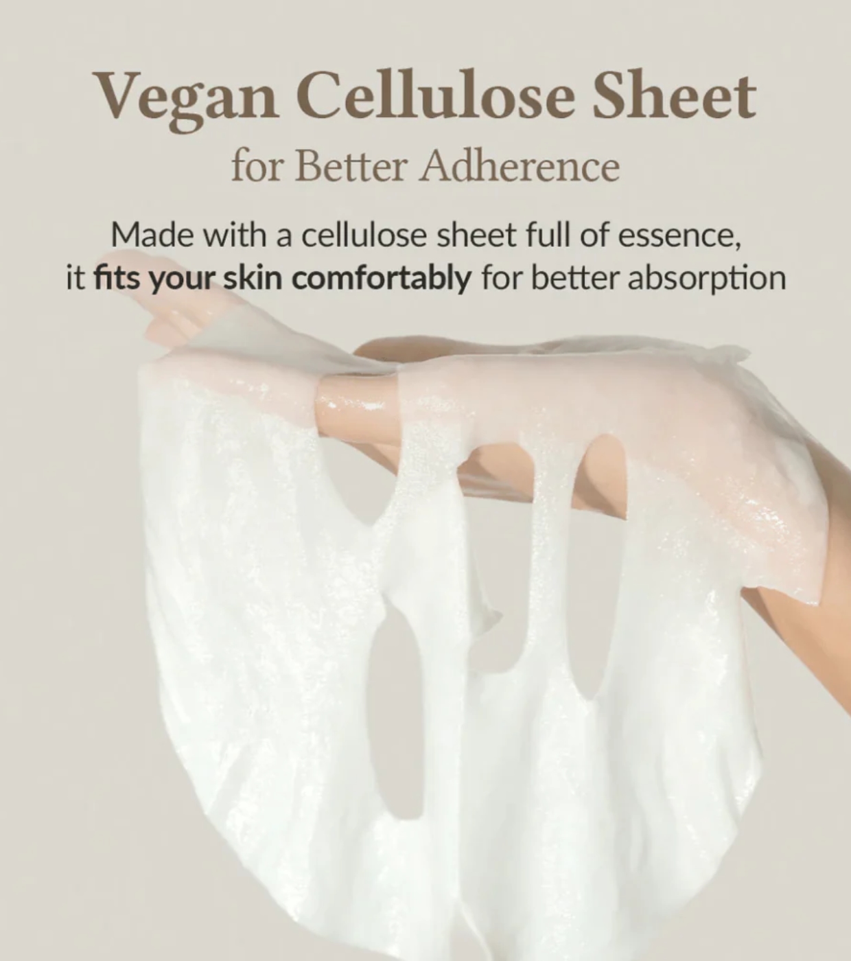 The mask is made with a high-adherence vegan cellulose fabric that fits perfectly to the face, facilitating the absorption of the active ingredients and enhancing their results in just 10–15 minutes.