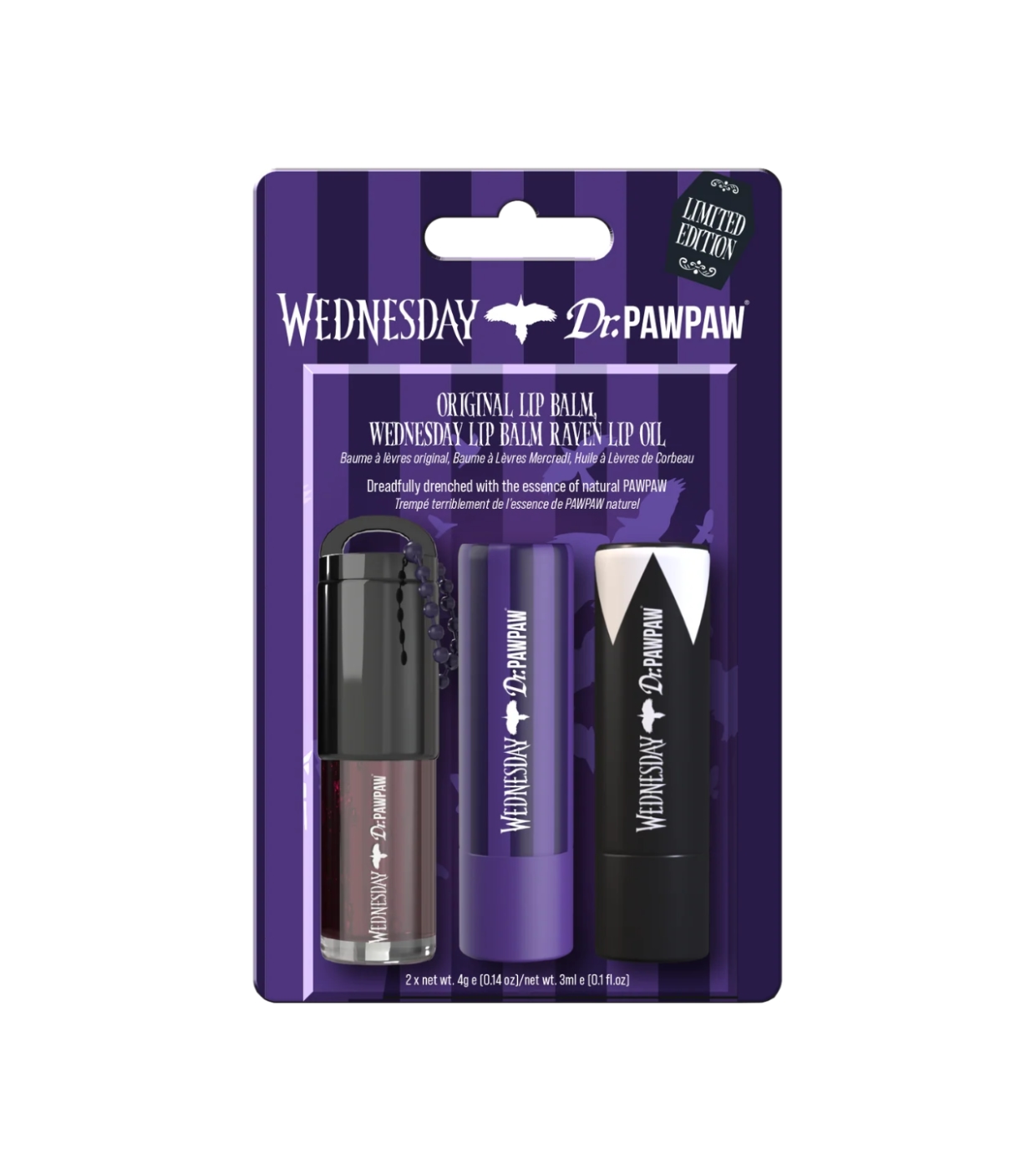For those who feel more comfortable in the shadows, the trio of lip balms and lip oil Dr.PAWPAW has arrived, an edition inspired by the mysterious and elegant style of Wednesday.