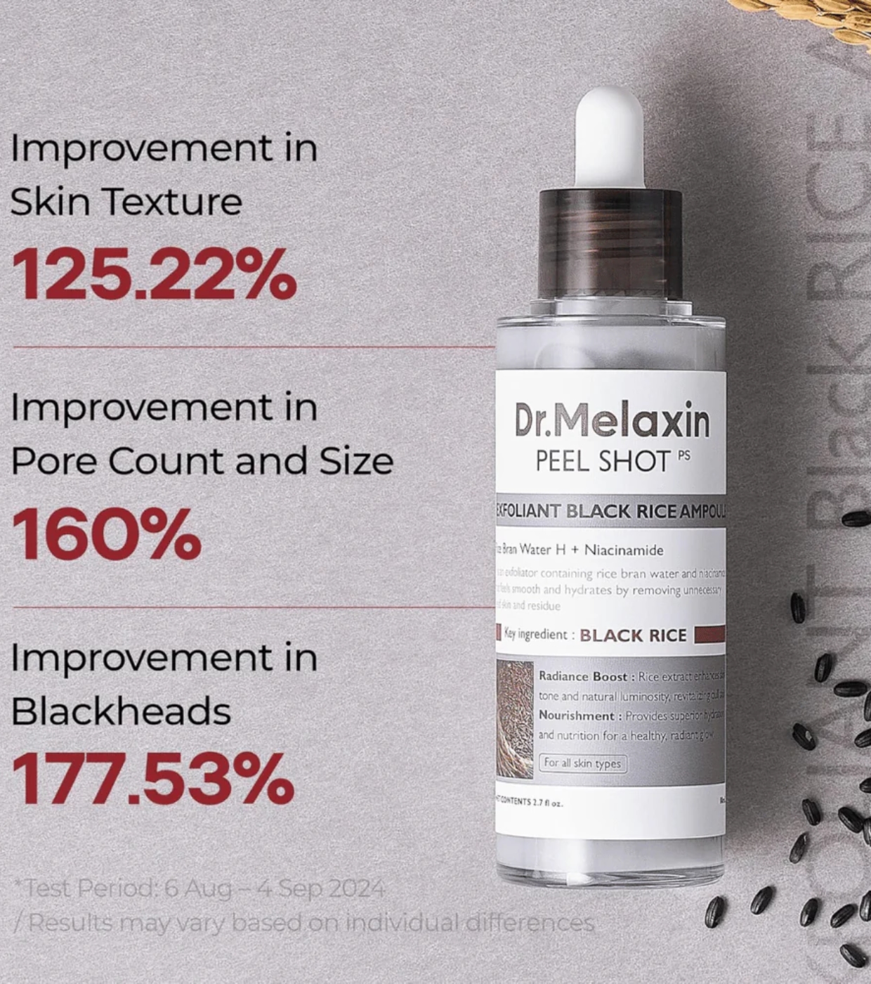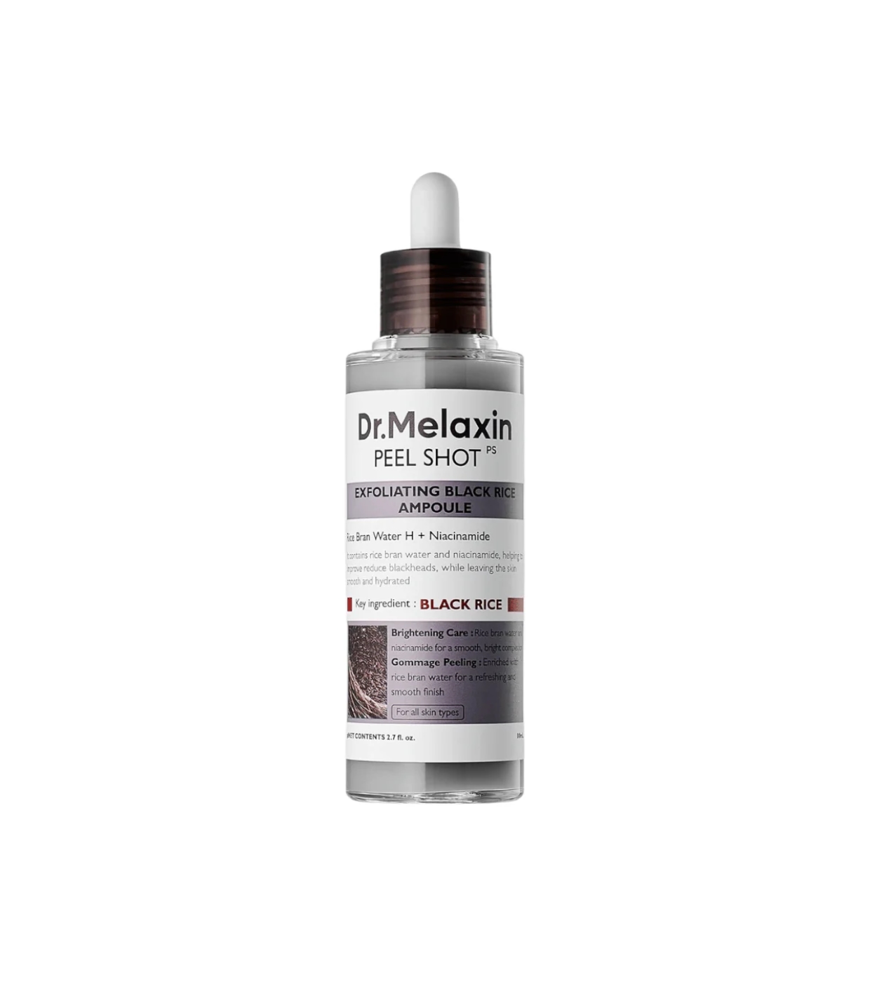 This exfoliating ampoule Peel Shot Black Rice from Dr.Melaxin is designed to offer a comprehensive pore treatment, helping to remove blackheads, regulate sebum and improve skin radiance without compromising hydration.