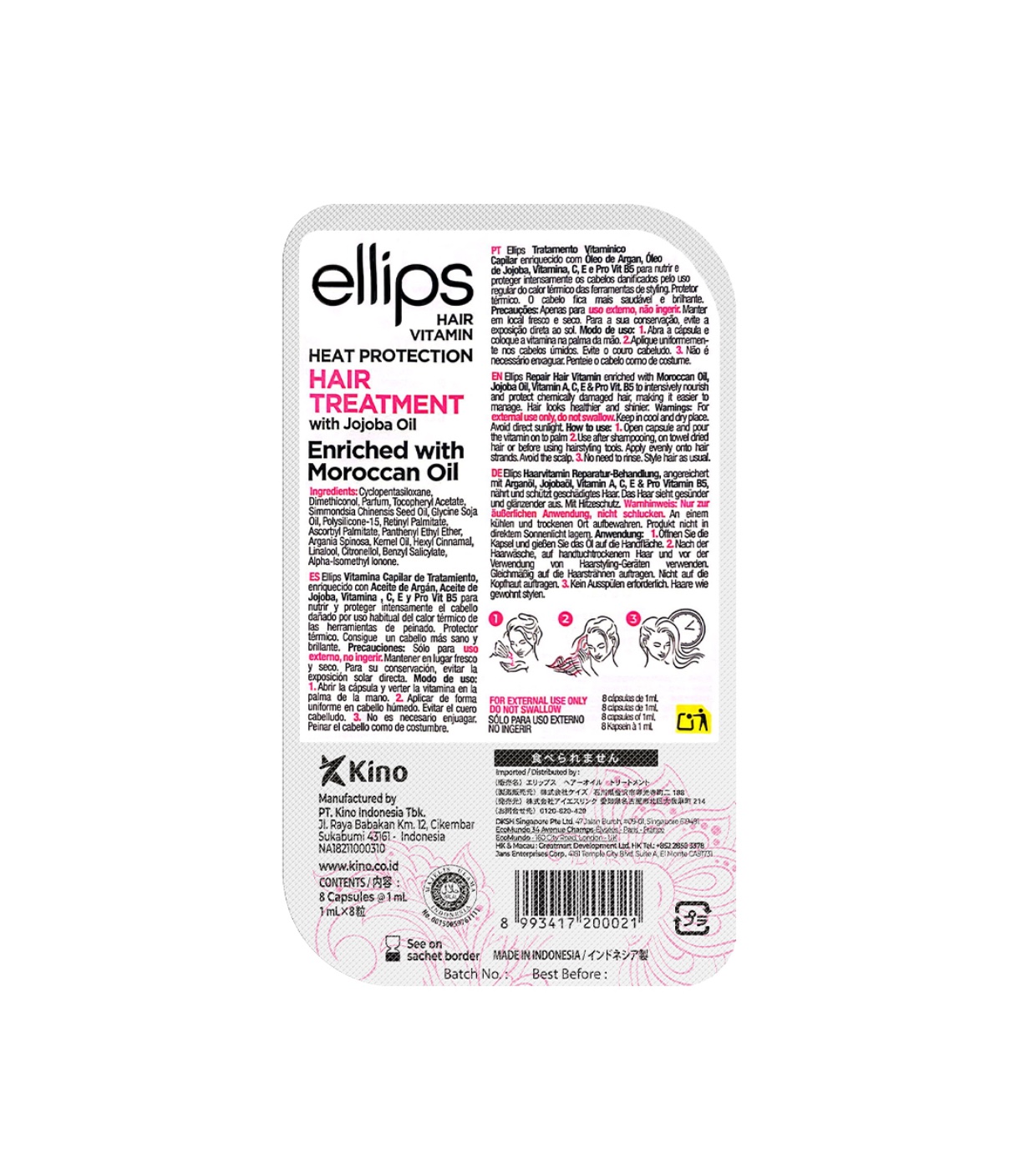 These serum ampoules are enriched with Vitamin C, E and B5, argan oil, and jojoba oil. to intensely nourish and protect hair damaged by regular use of irons or thermal heat tools.