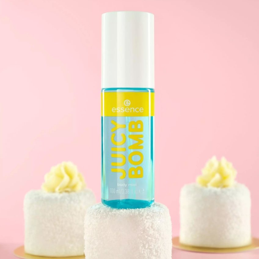 Indulge in the delicious aroma of your favorite coconut and vanilla cake with the JUICY BOMB 105 Coconut Chill body mist from essence .