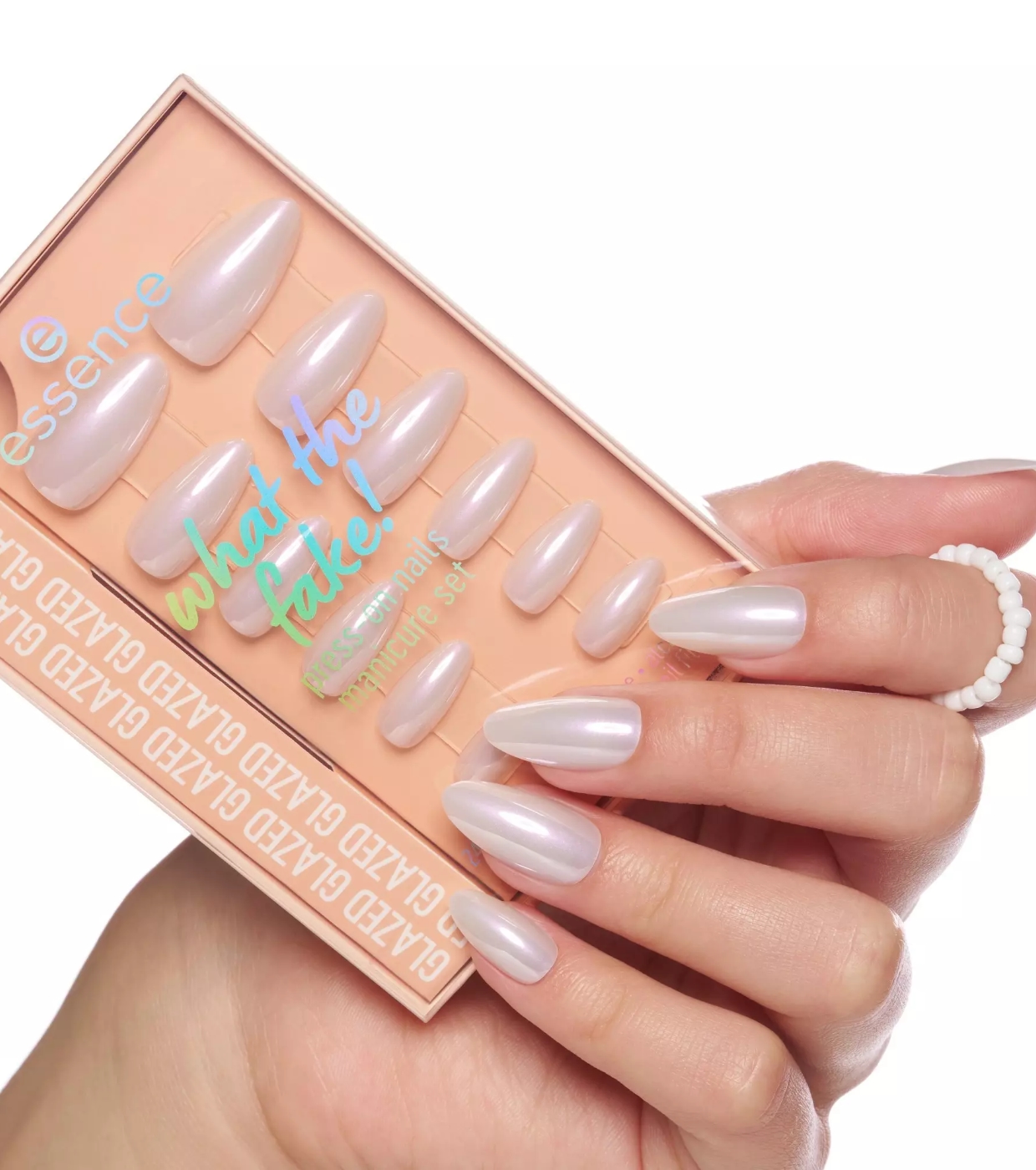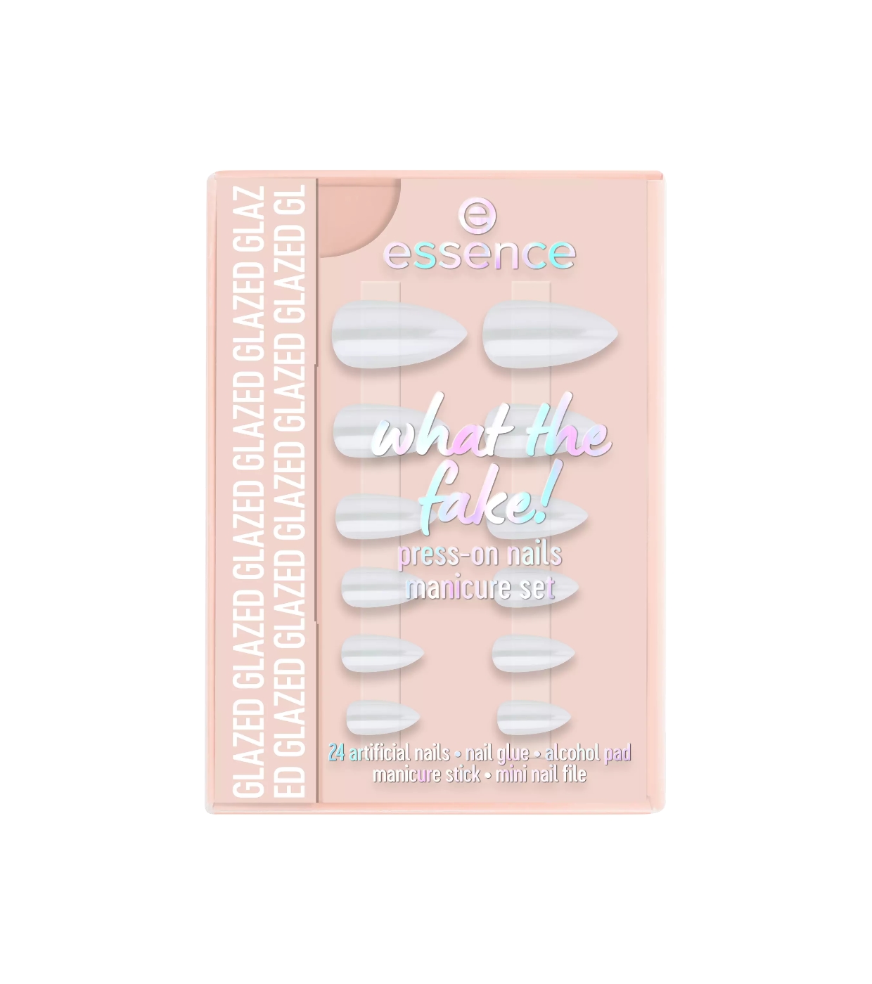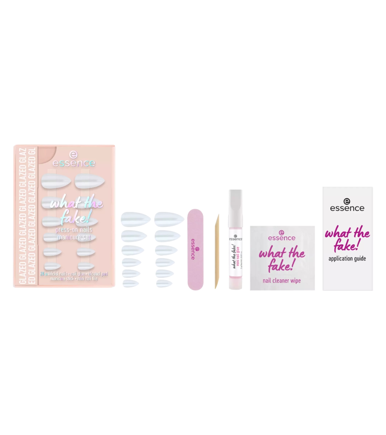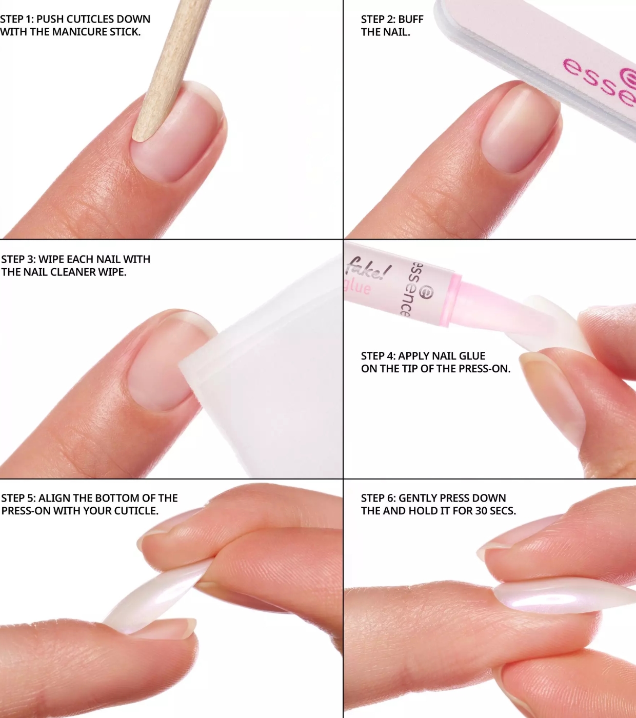The set also includes nail glue, a manicure stick, a mini nail file, and a nail cleansing wipe—all the essentials for a smooth, long-lasting manicure.