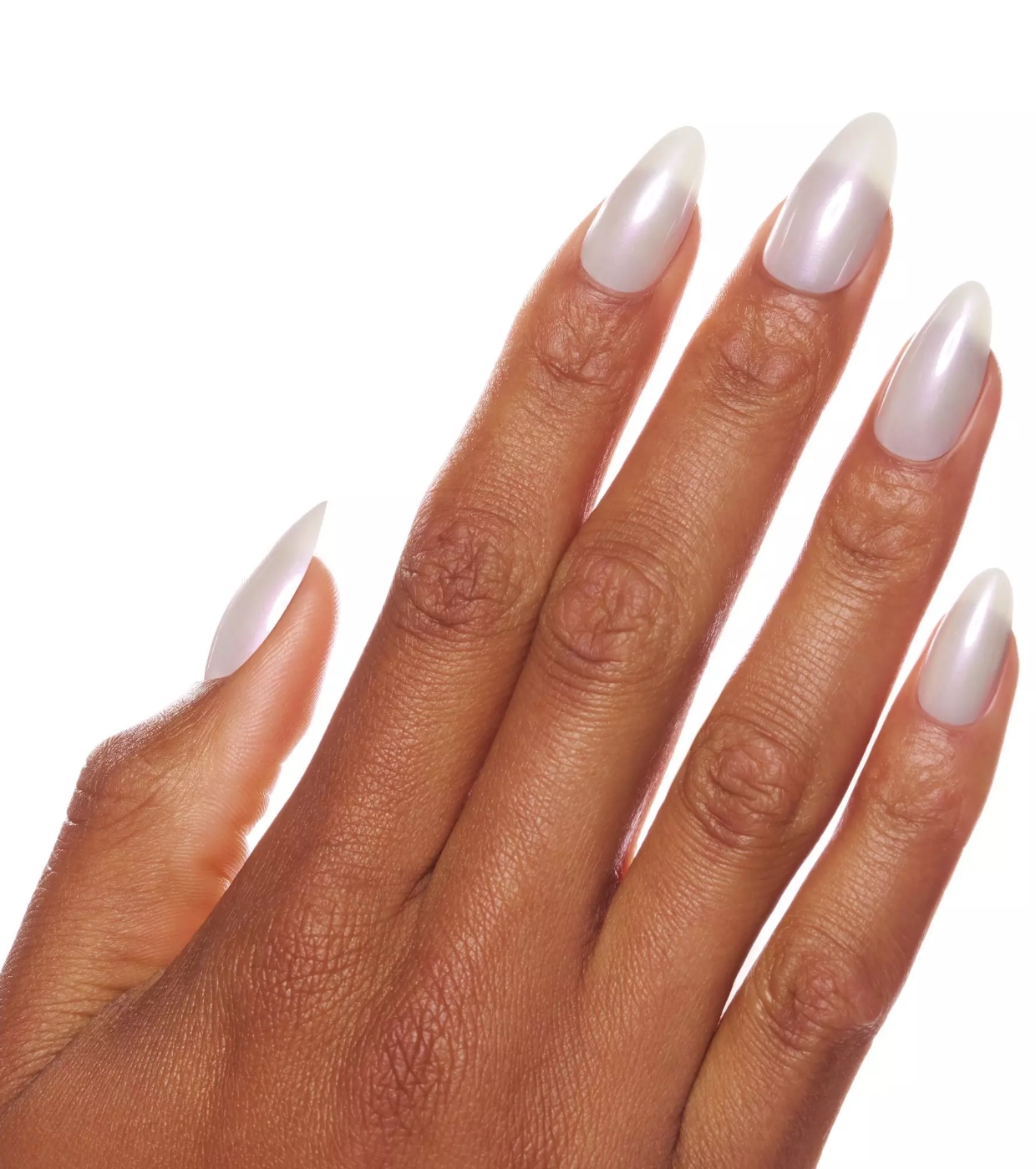 This set includes 24 high-quality press-on nails in 12 different sizes, designed in an almond shape with a subtle white polish effect.