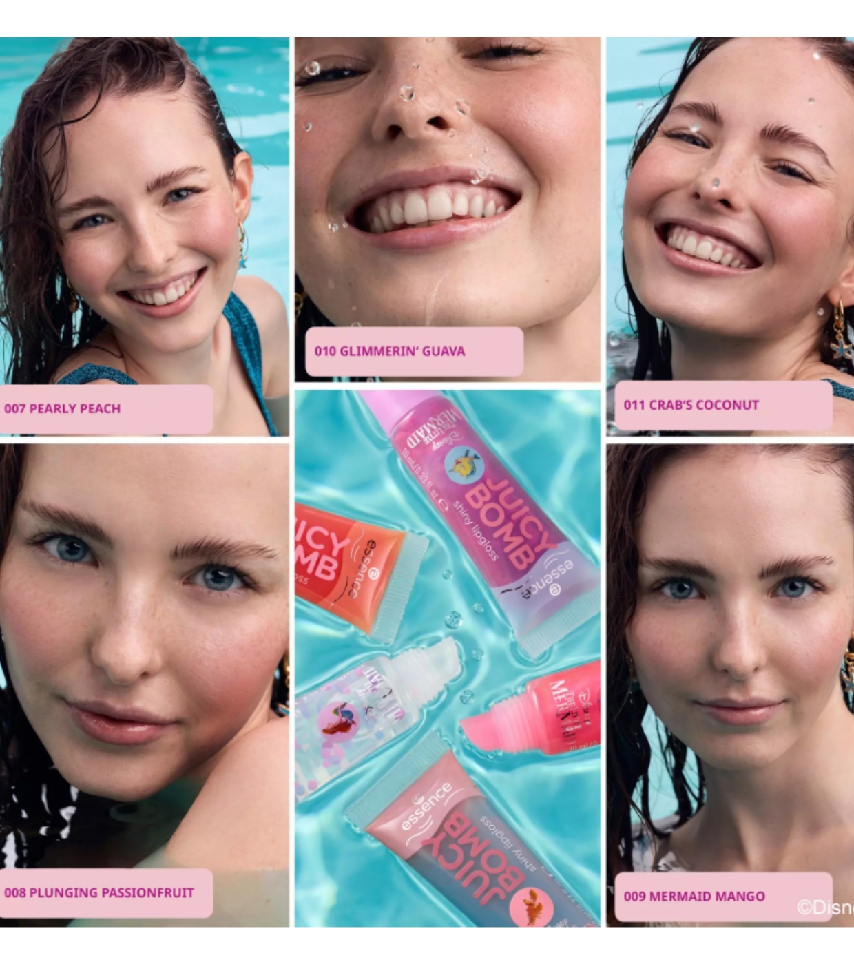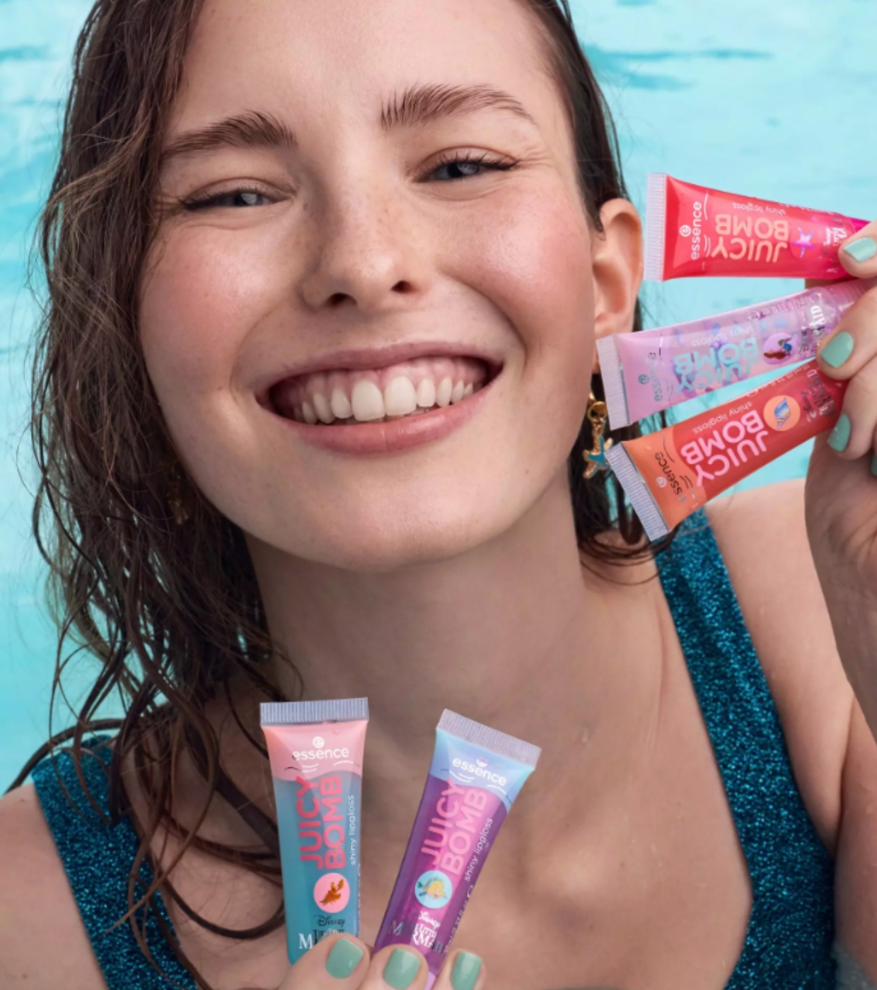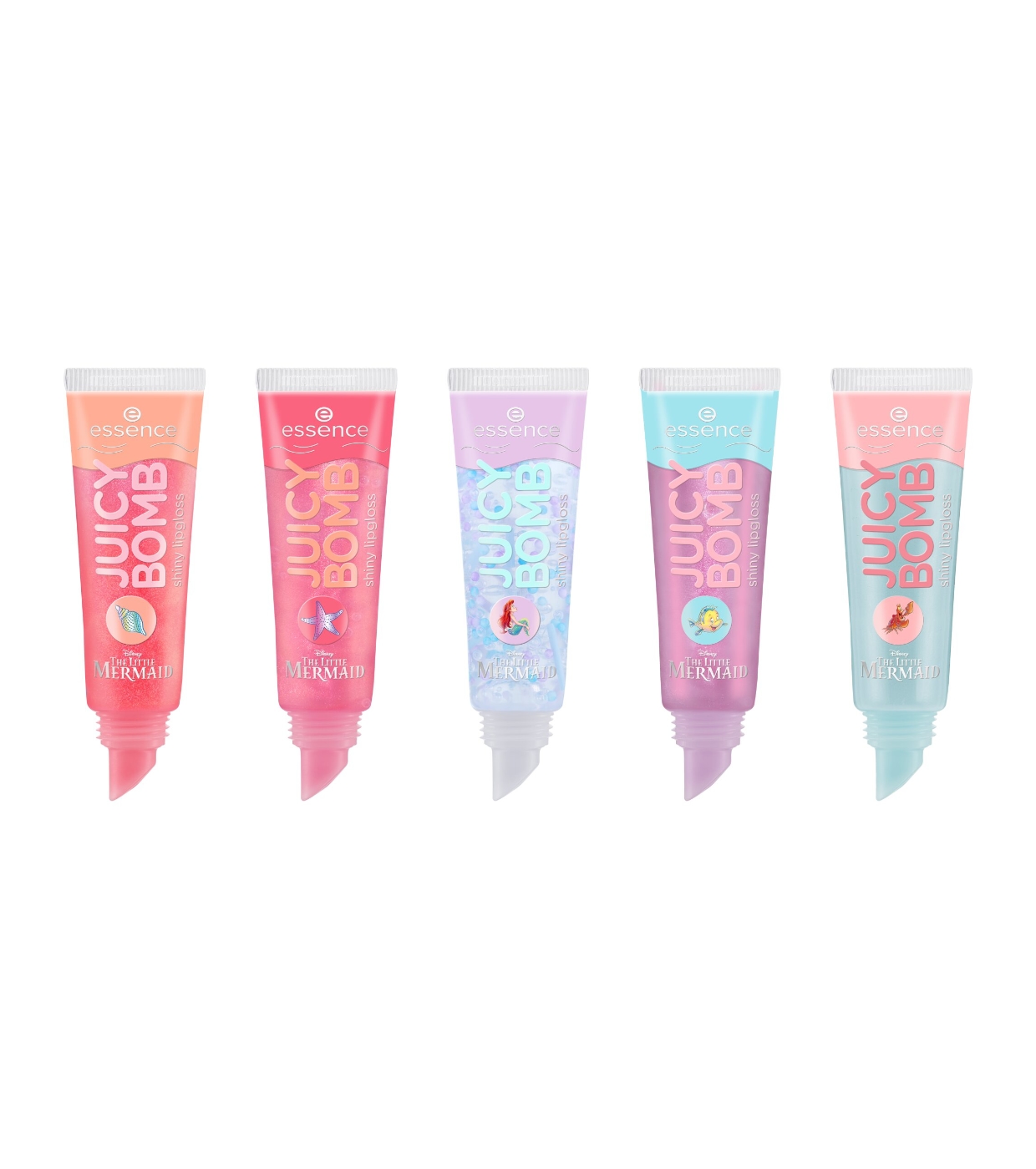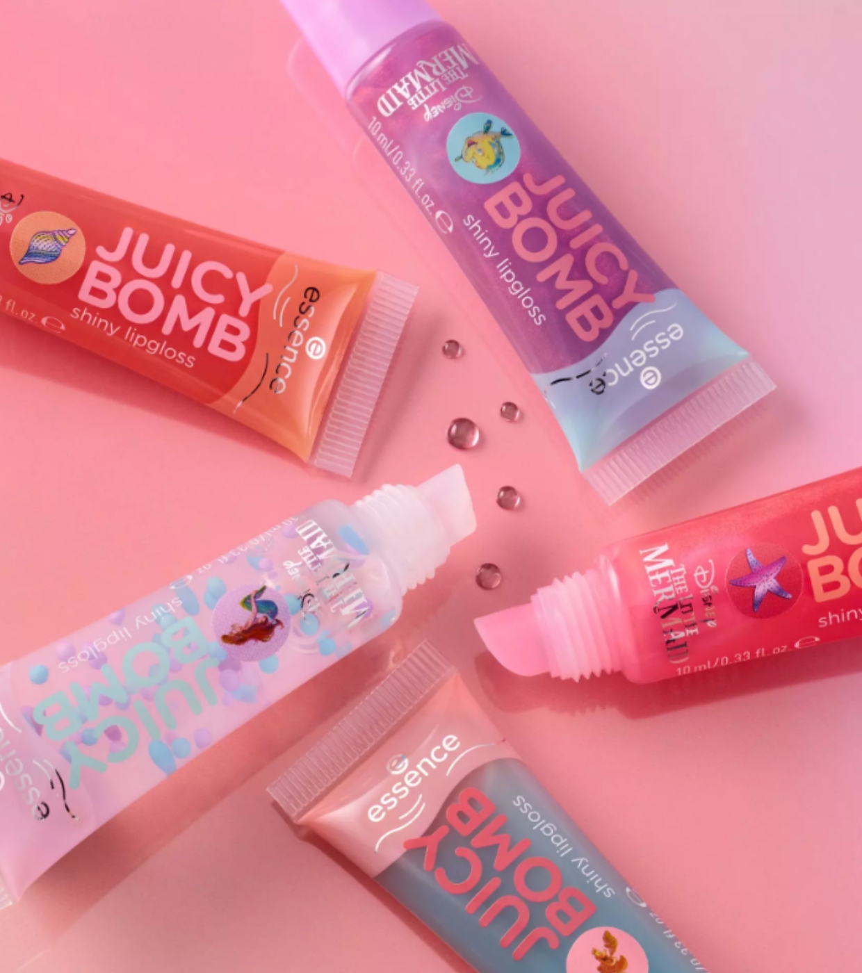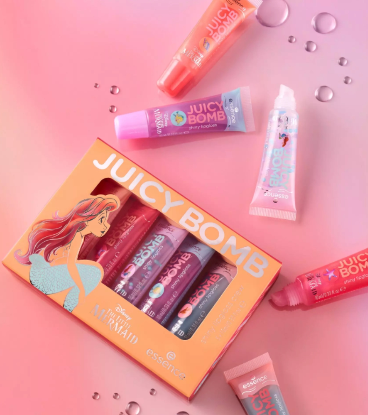 Fill your lips with shine with the Juicy Bomb lip gloss set from essence , a special edition inspired by The Little Mermaid .