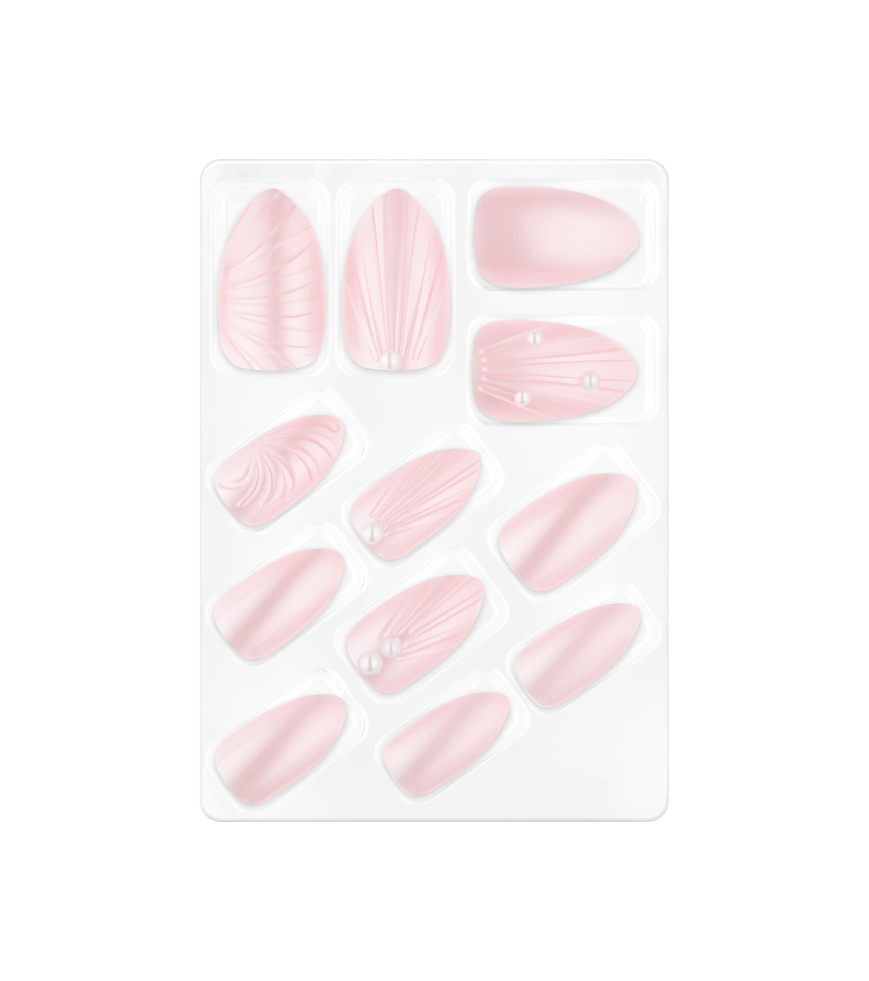This set includes 12 press-on nails with adhesives, designed in delicate pink tones with reliefs inspired by seashells and small pearly details that add an elegant and magical touch.