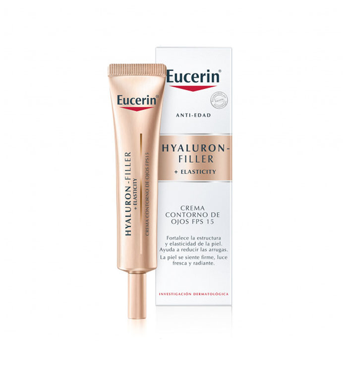 Eucerin Hyaluron-Filler + Elasticity Eye Contour SPF 15 is an anti-aging eye contour cream that fills in deep wrinkles and improves skin elasticity.