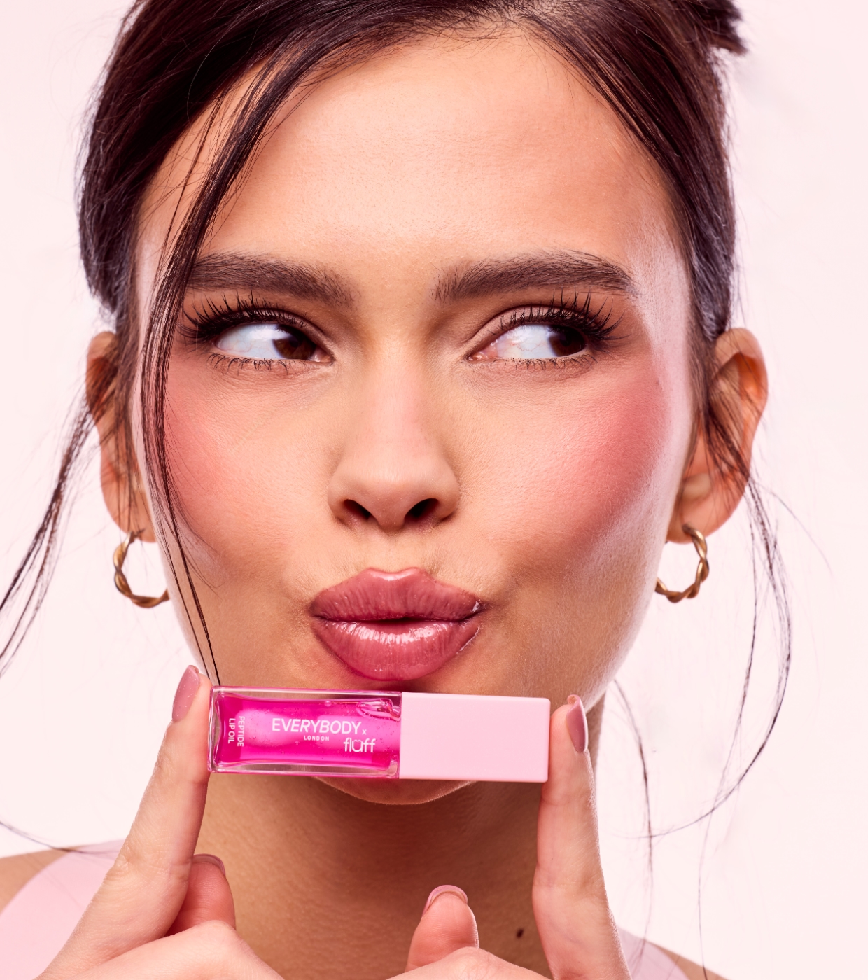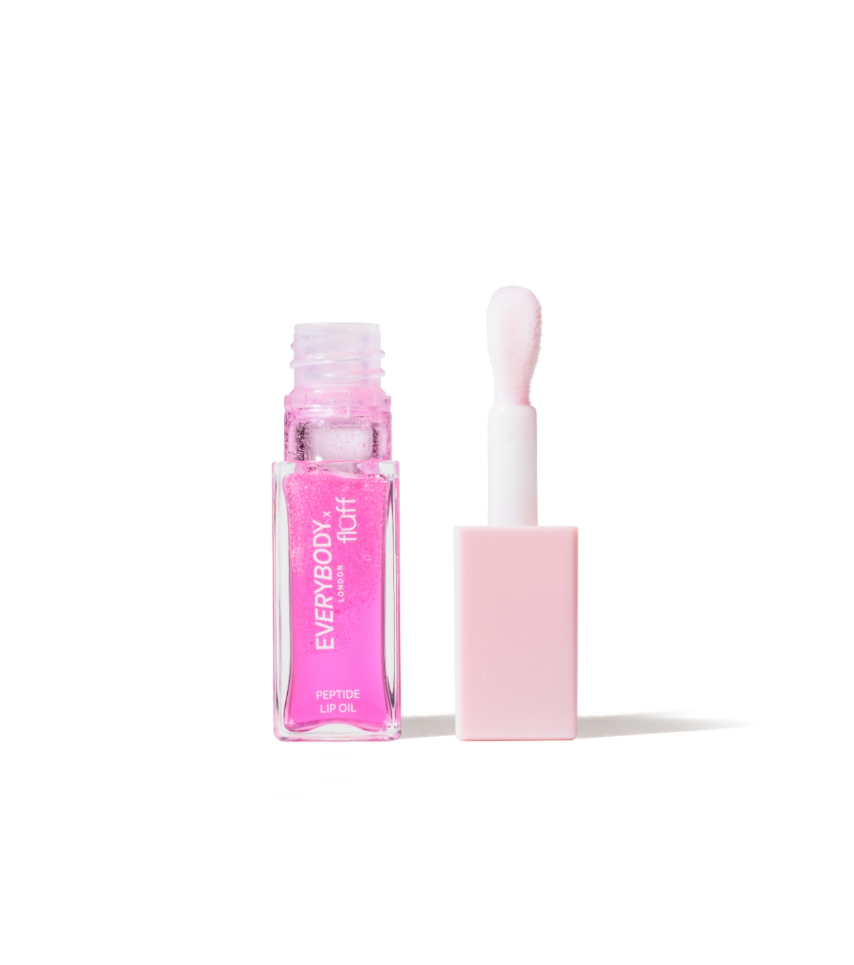 Discover the peptide lip oil from the Everybody London x Fluff collaboration , presented in a beautiful transparent container with a pink design.