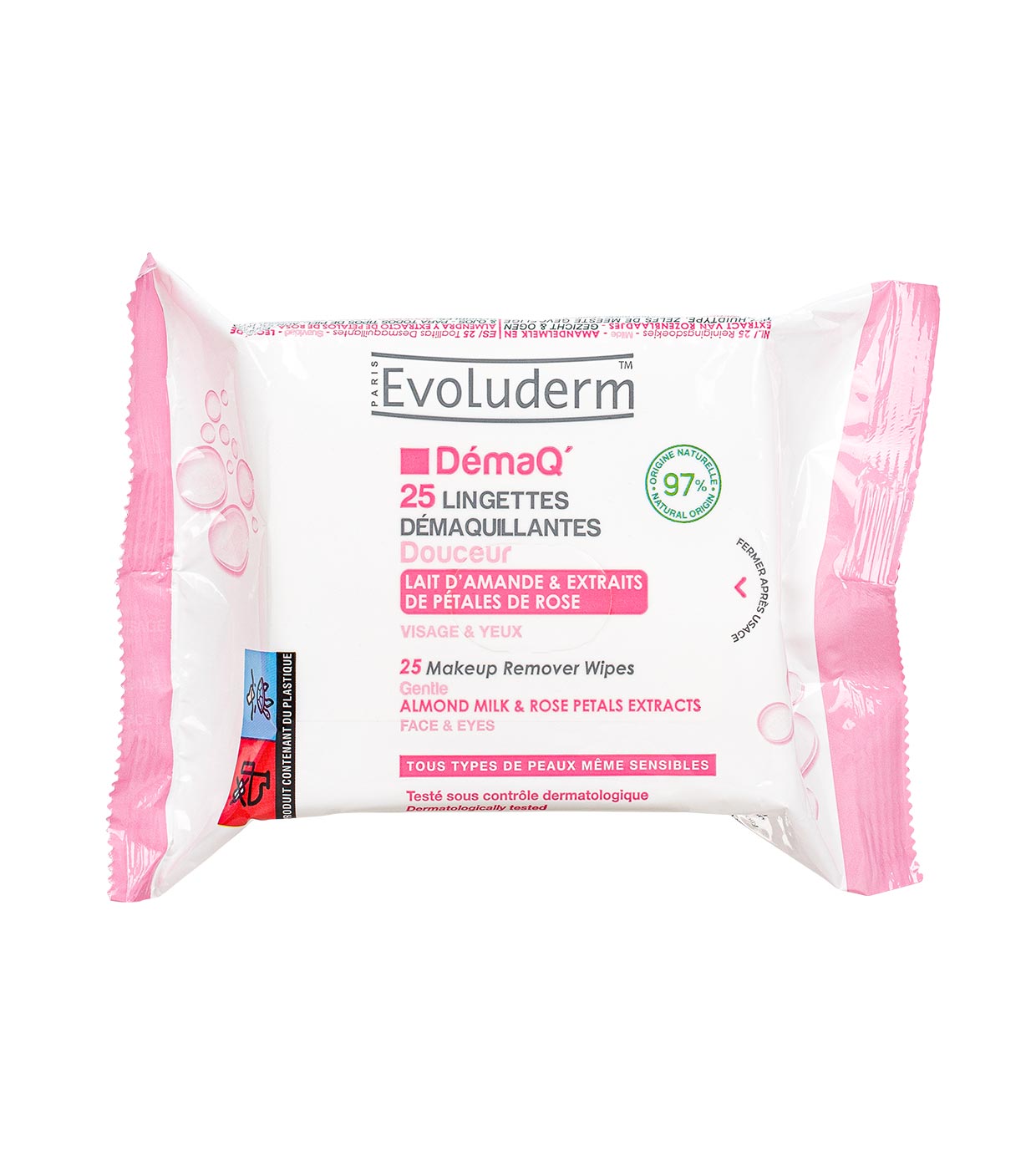 Gentle cleansing wipes with almond milk and rose petal extract for all skin types 25 units of Evoluderm.