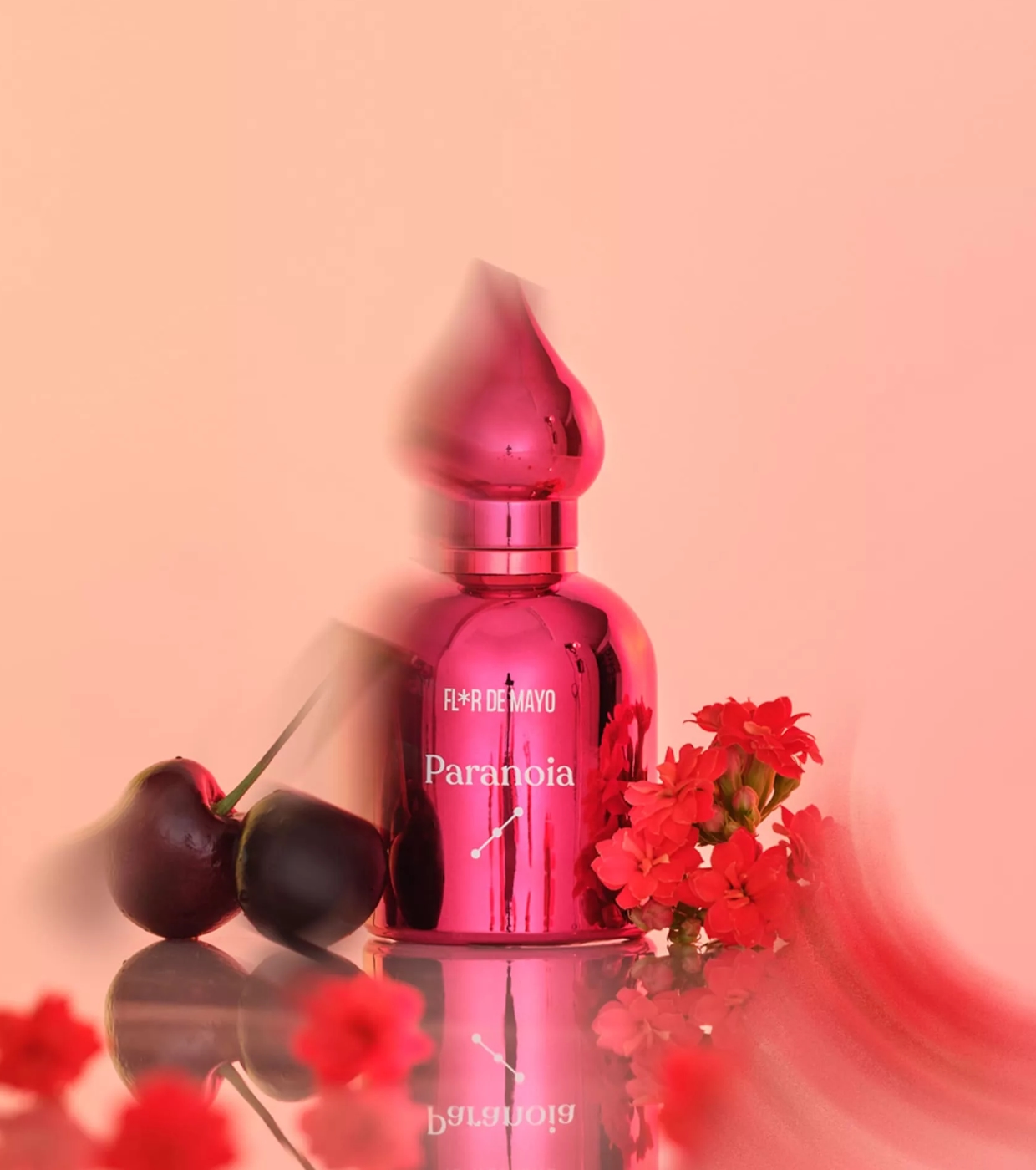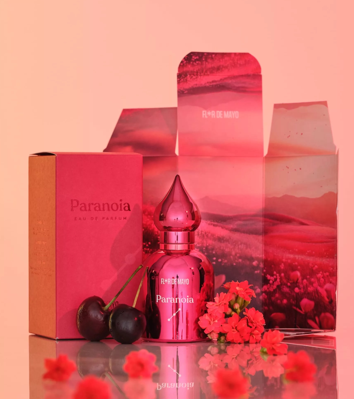 This particular perfume moves between dream and wakefulness, combining the juicy sweetness of cherry, the gourmand sensuality of praline, and the spiritual depth of palo santo.