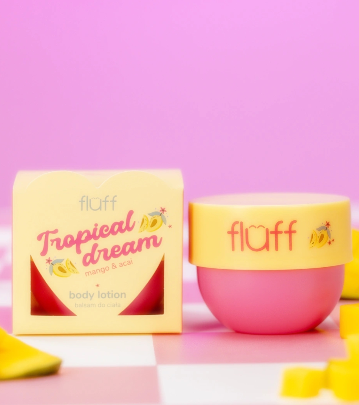 Immerse yourself in a vibrant sensorial experience with Fluff Mango & Açaí Body Lotion , a nourishing balm that combines intense hydration with an irresistible fruity scent.