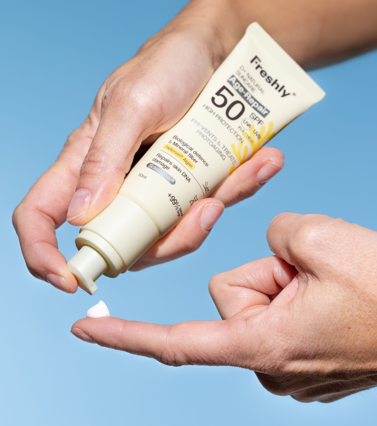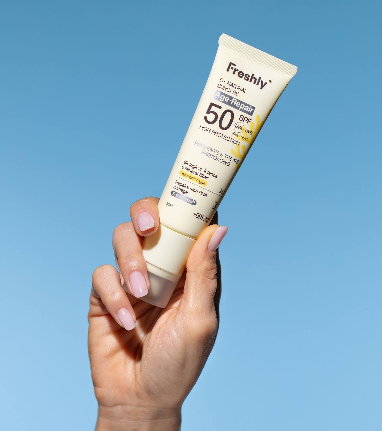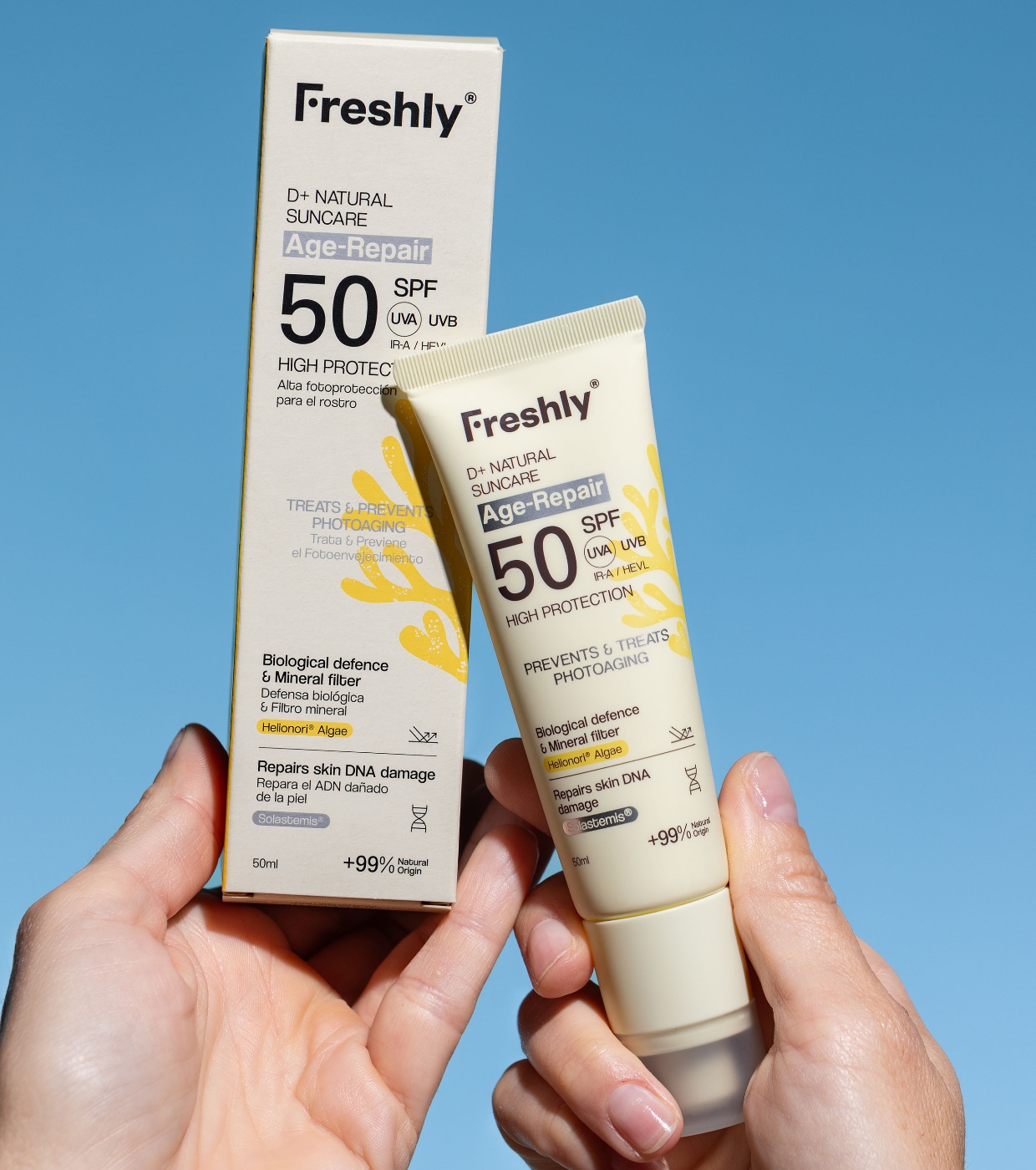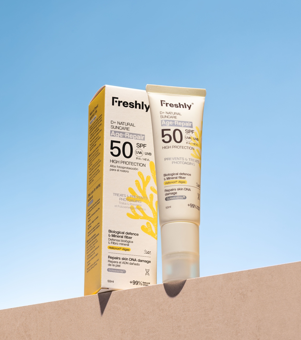 Prevent and reduce the signs of photoaging with this facial sunscreen D+ Natural Suncare SPF50 from Freshly Cosmetics formulated with 100% mineral filters, without chemical filters or nanoparticles.